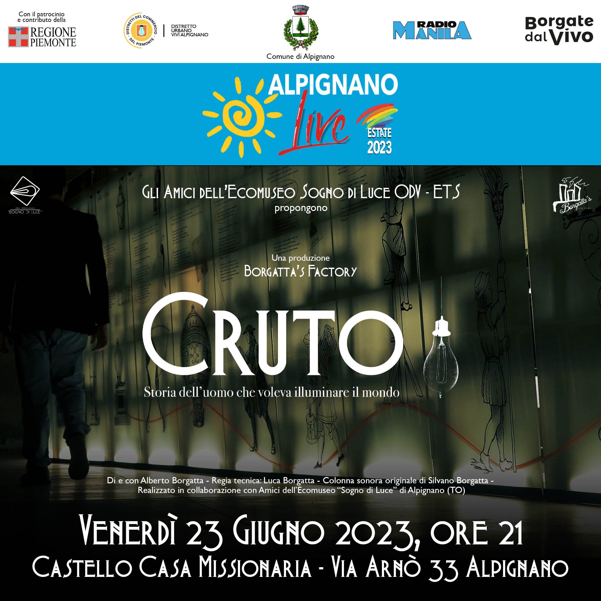 Il debutto nella rassegna Alpignano Live è frutto della collaborazione con l'associazione Amici dell'Ecomuseo "Sogno di Luce" ODV : un viaggio nella biografia di un grande piemontese spesso dimenticato, capace di anticipare nei risultati il suo più celebre collega Thomas Edison, portando la sua luce in tutto il pianeta e avviandolo all’era dell’elettricità.