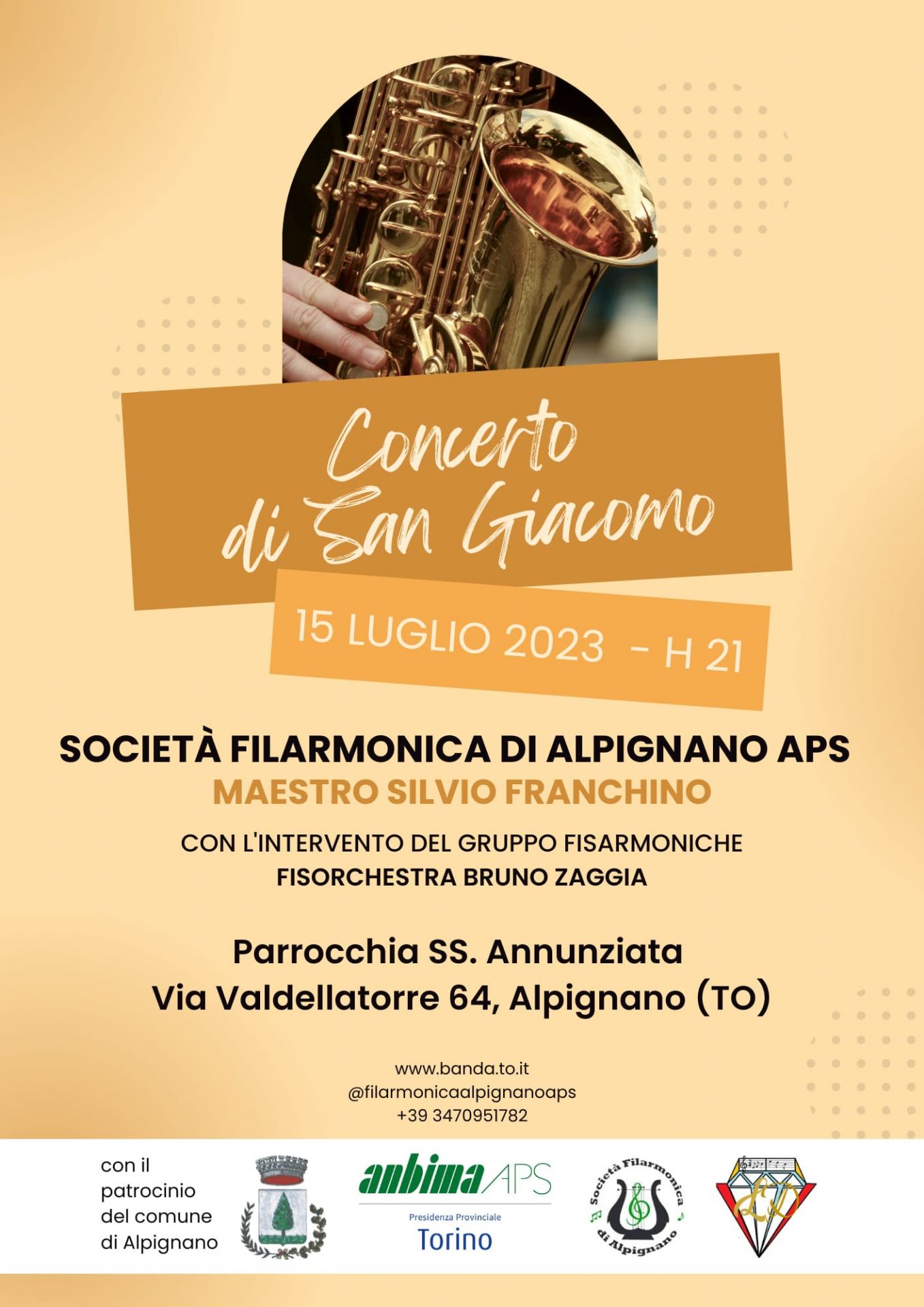 La Società Filarmonica di Alpignano, con l'intervento del Gruppo Fisarmoniche della Fisorchestra Bruno Zaggia, organizza il tradizionale concerto di San Giacomo sabato 15 luglio, alle 21 presso la Parrocchia SS.Annunziata in via Valdellatorre 64.