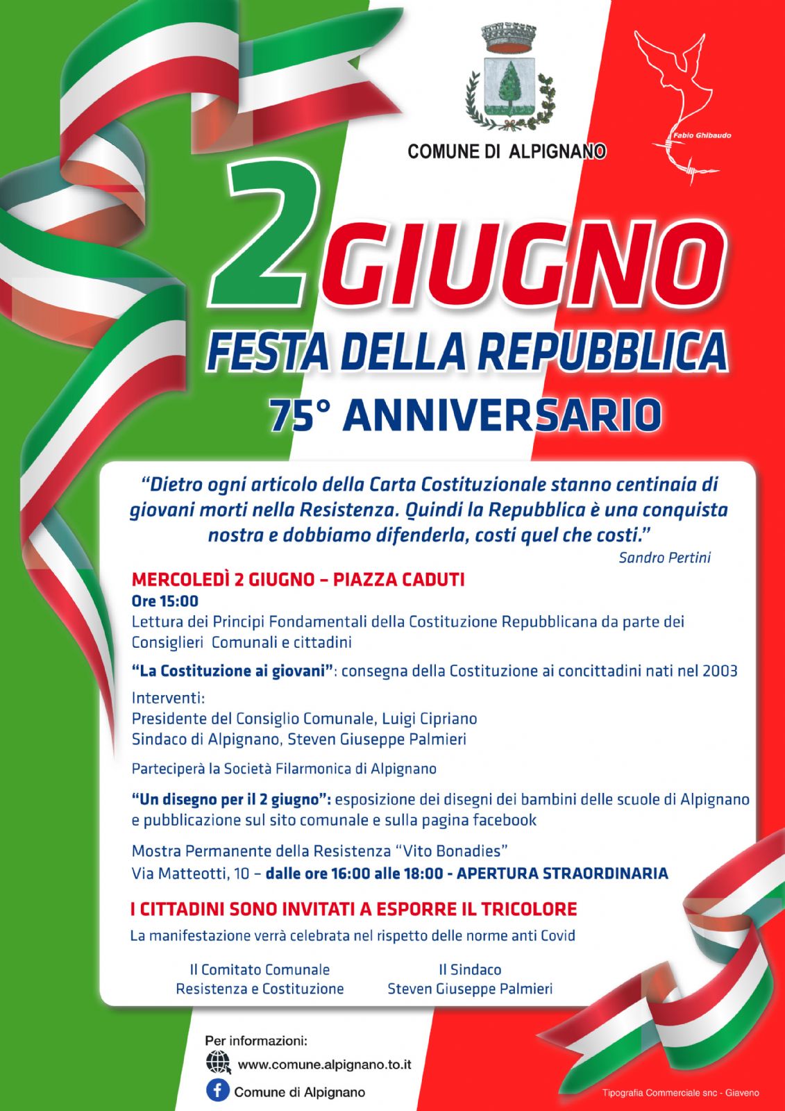 L'Amministrazione Comunale di Alpignano e il Comitato Comunale Resistenza e Costituzione celebrano il 75° anniversario della Repubblica Italiana, mercoledì 2 giugno in Piazza Caduti, alle ore 15:00.