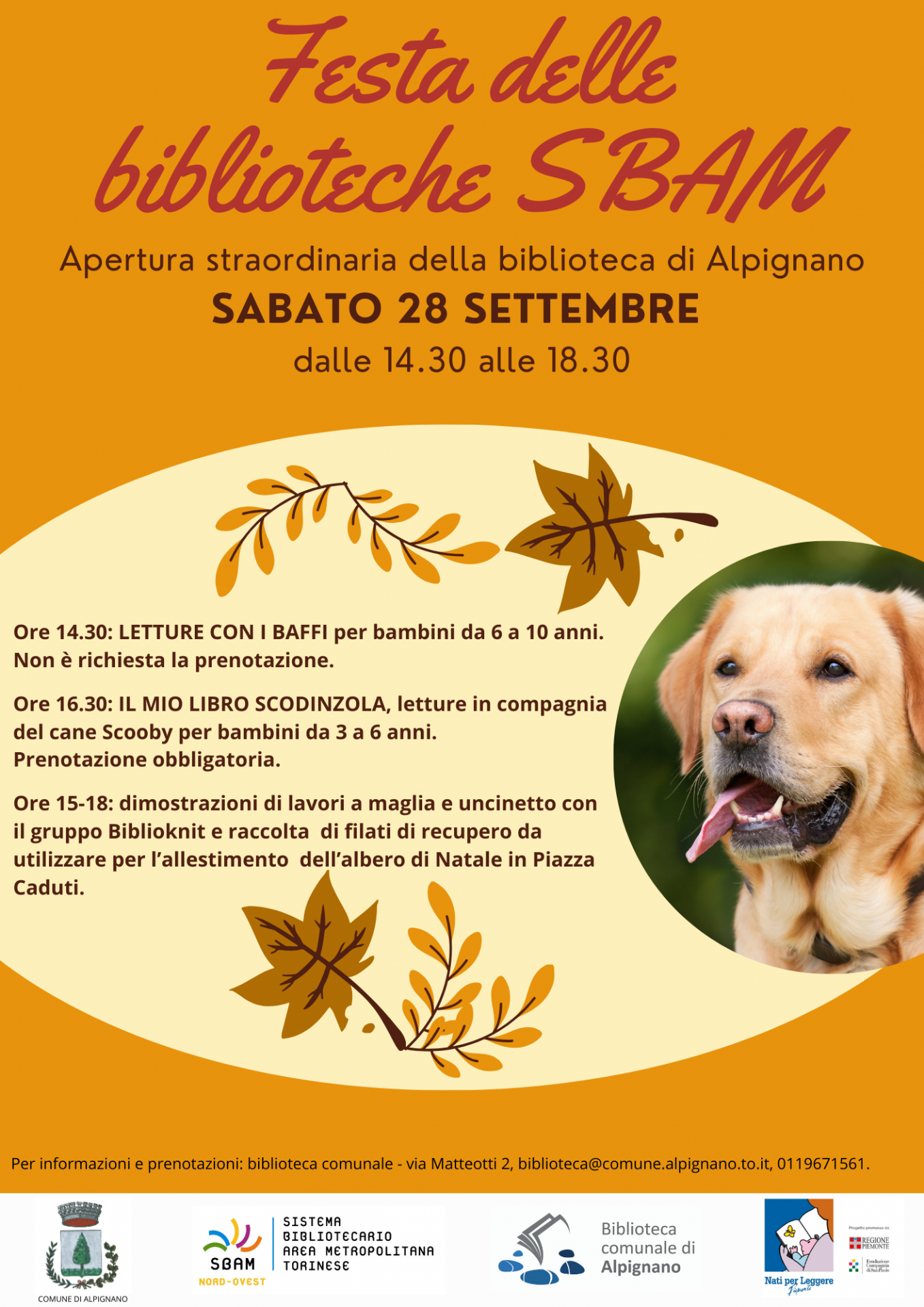 - 16.30: IL MIO LIBRO SCONDINZOLA; letture in compagnia del cane Scooby per bambini da 3 a 6 anni. Prenotazione obbligatoria.