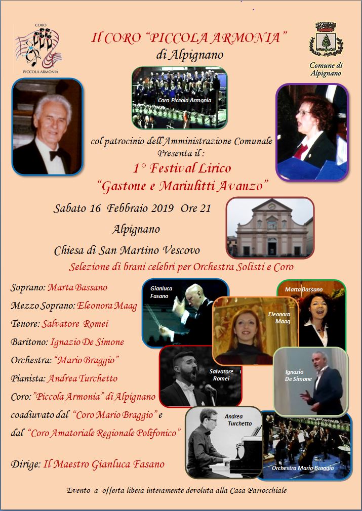 L'associazione culturale Coro Piccola Armonia organizza la prima edizione del Festival Lirico "Gastone e Marioliti Avanzo" sabato 16 febbraio alle ore 21.00 presso la Parrocchia San Martino Vescovo di Alpignano.