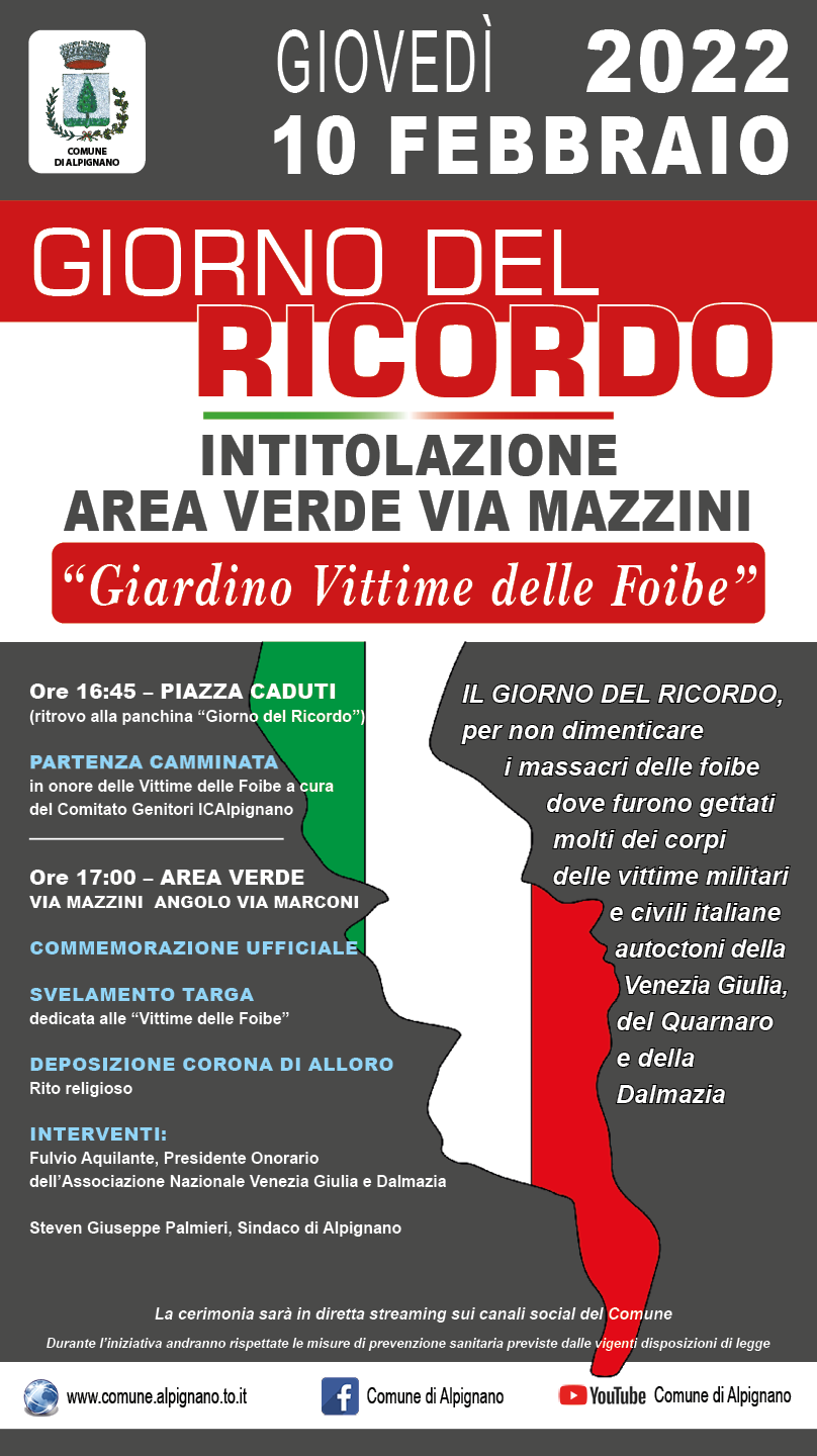 Per conservare la memoria di un così tragico e oscuro periodo della storia del nostro paese, il Consiglio Comunale di Alpignano ha approvato all'unanimità, nella seduta del 29 giugno 2021, l'intitolazione dell'area verde di via Mazzini angolo via Marconi alle Vittime delle Foibe.
