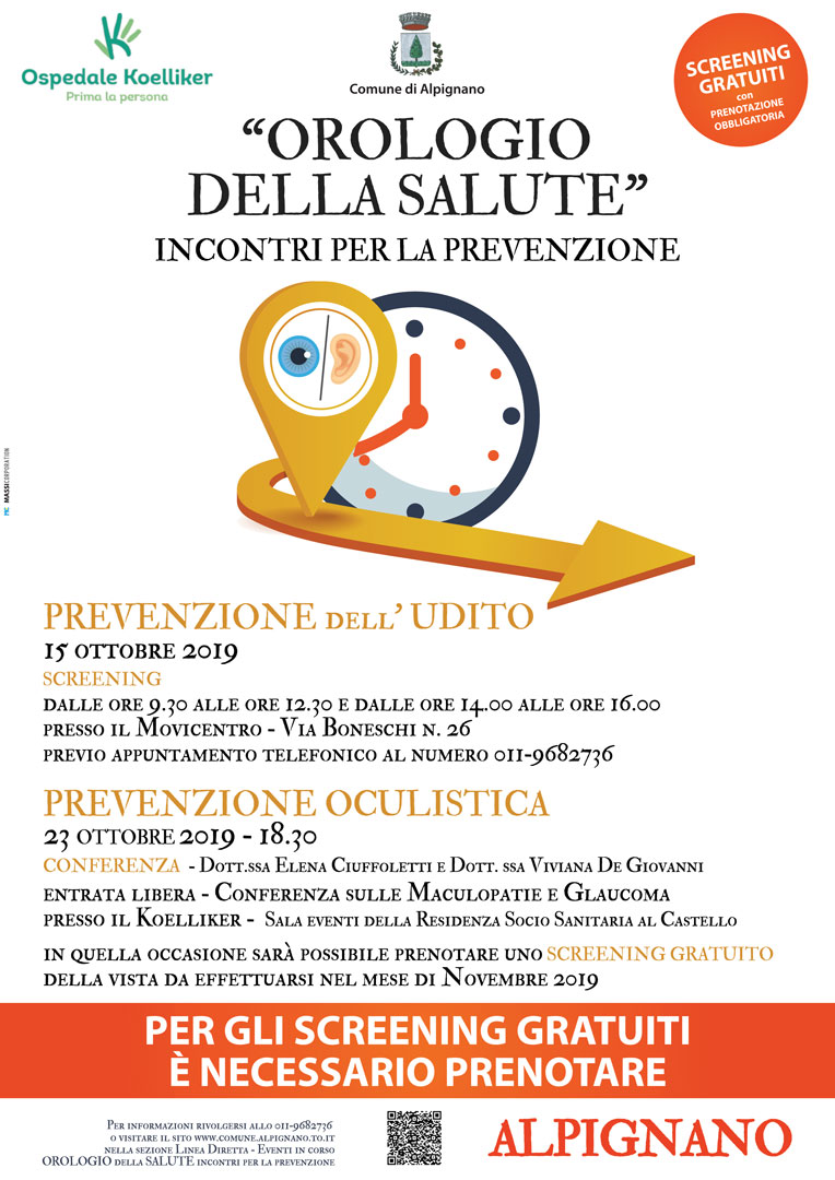 15 ottobre 2019 dalle ore 9.30 alle ore 12.30 e dalle ore 14.00 alle ore 16 Screening dell'udito presso il movicentro Via Boneschi n. 26 per prenotazioni tel al n. 011-9682736 dal lunedi al venerdì dalle ore 9.00 alle ore 12.00 e il martedì e il giovedì anche dalle ore 15.30 alle ore 17.30