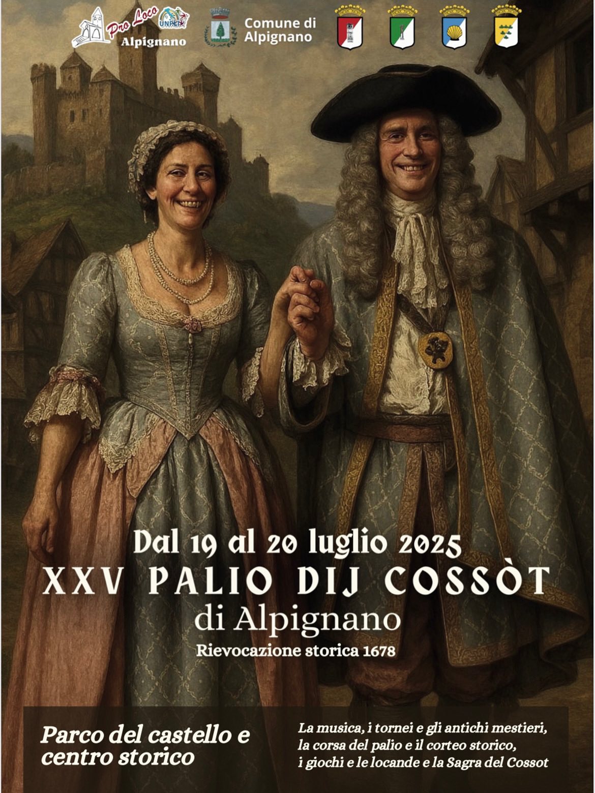 Alle 21:15 di sabato in Piazza Parrocchia ci sarà il primo ballo della Corte del Conte Provana a cui seguirà la cerimonia di assegnazione del Cossòt d'Oro.