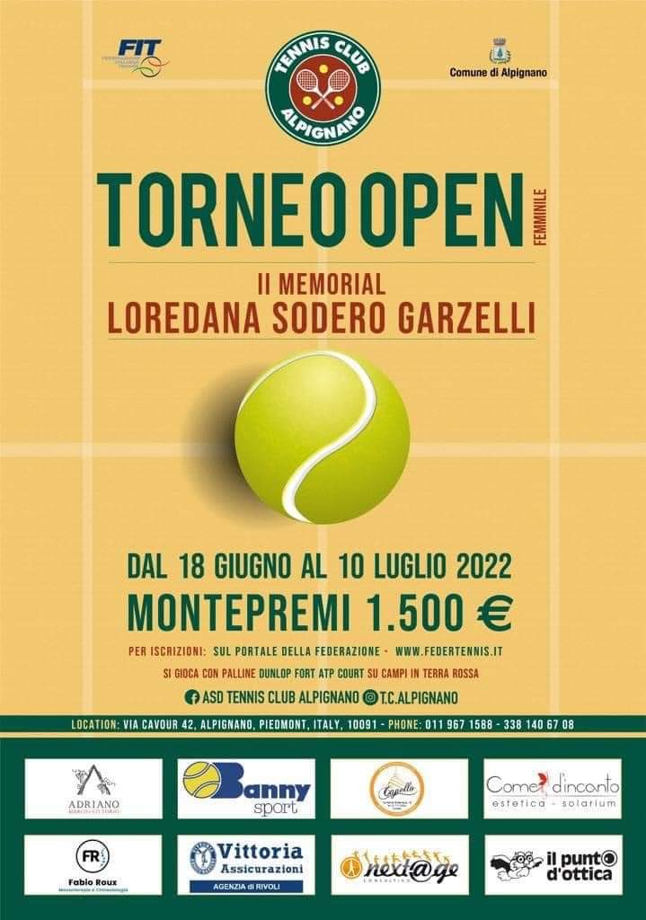 Sono iniziati i Tornei Open Femminile "II^ Memorial Loredana Sodero Garzelli" e Maschile "Città di Alpignano" in programma fino al 10 luglio 2022 presso l'Impianto sportivo Tennis Alpignano, via Cavour 42.