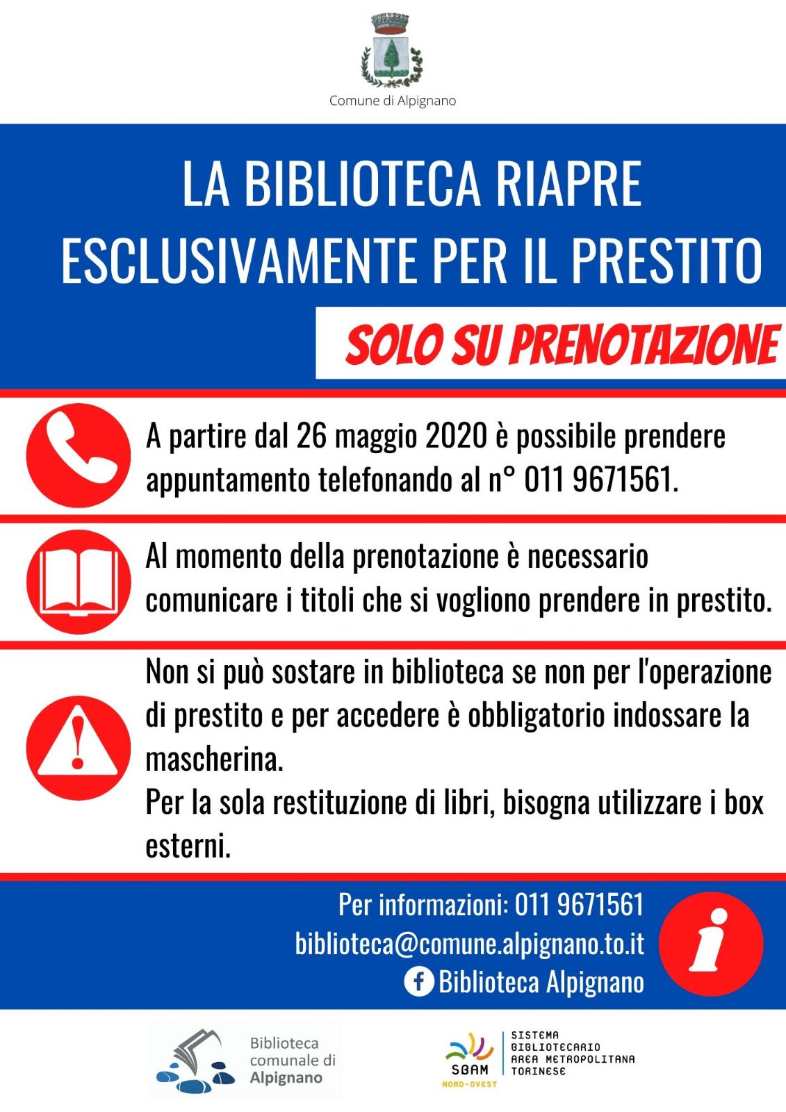 Dal 26 maggio 2020 la biblioteca riaprirà al pubblico esclusivamente per il servizio di prestito e su prenotazione; da quella data si potrà prenotare telefonando al numero 011 9671561 e comunicando quali documenti si desiderano prendere in prestito.