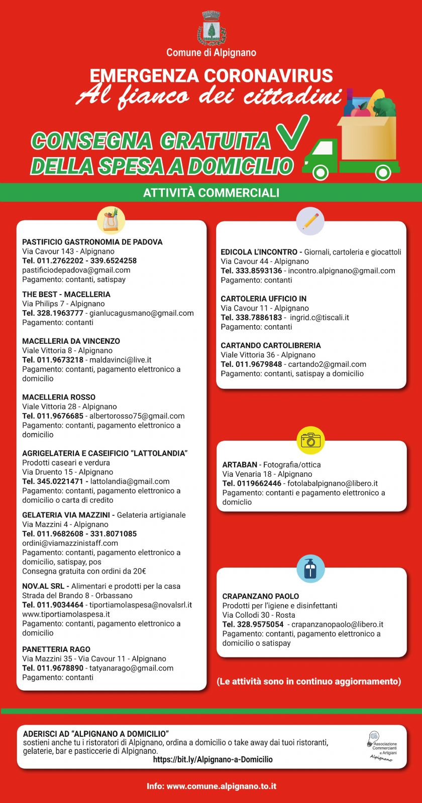 Gli esercizi commerciali di Alpignano che intendono offrire il servizio GRATUITO di consegna a domicilio della spesa, possono dare la loro adesione compilando il modulo e inviandolo al seguente indirizzo email protocollo@comune.alpignano.to.it