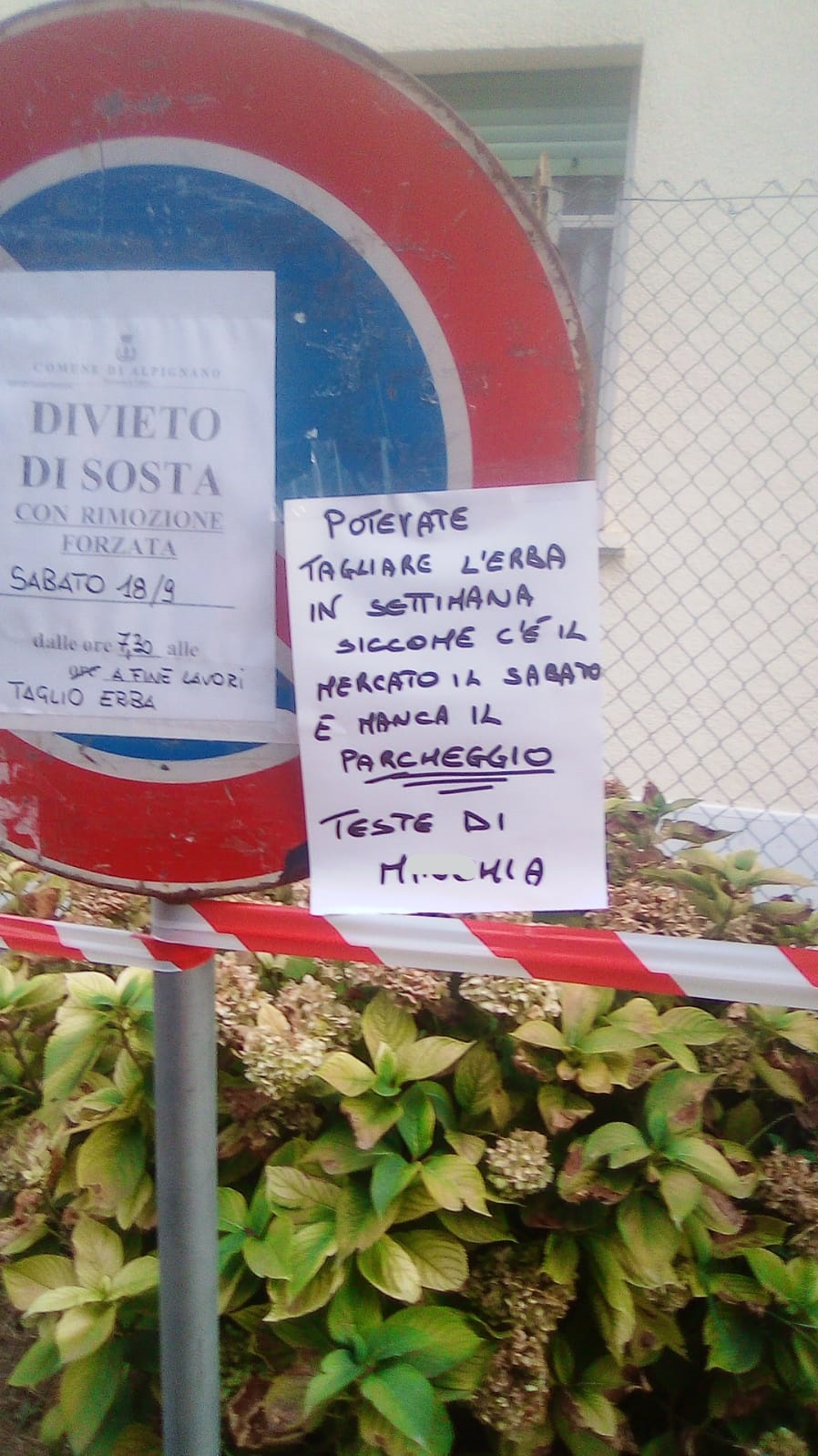 Poco dopo ci veniva segnalata la presenza di un cartello che così recitava “potevate tagliare l'erba in settimana siccome c'è il mercato il sabato e manca parcheggio teste di m......a”.