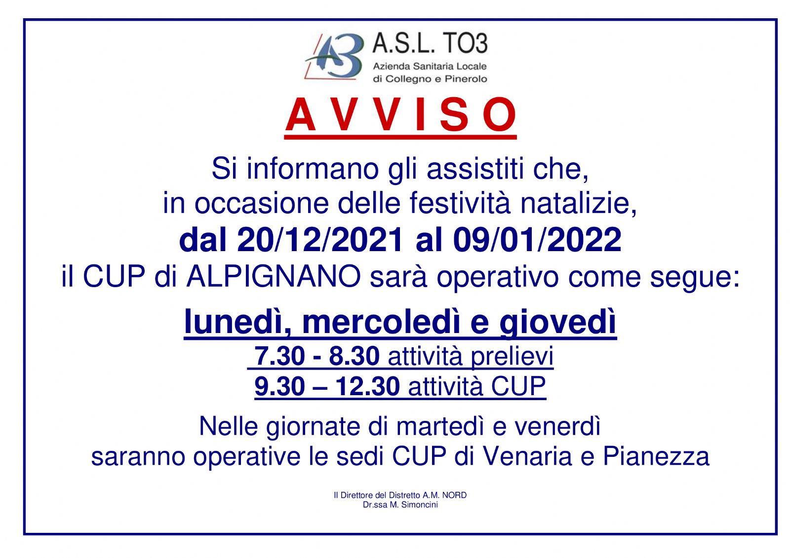 In occasione delle festività natalizie, dal 20 dicembre 2021 al 9 gennaio 2022, il CUP di Alpignano sarà operativo come segue: