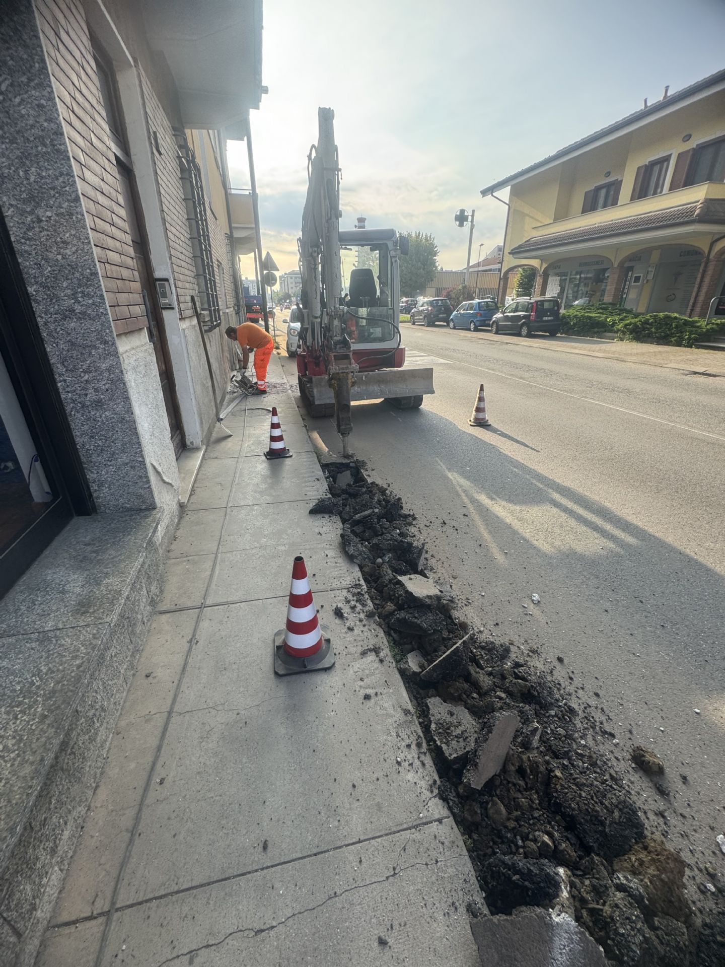 Oggi sono in corso i lavori di scavo di parte della strada per la posa della cordolatura finalizzato alla realizzazione di un nuovo tratto di marciapiede (PEBA) in via Cavour lato sinistro.