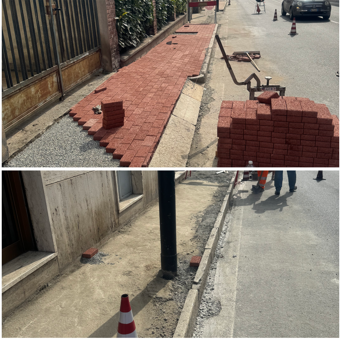 Oggi sono in corso i lavori di posa degli autobloccanti del nuovo marciapiede di via Cavour lato sinistro nel tratto compreso tra via San Gillio e via Toti.