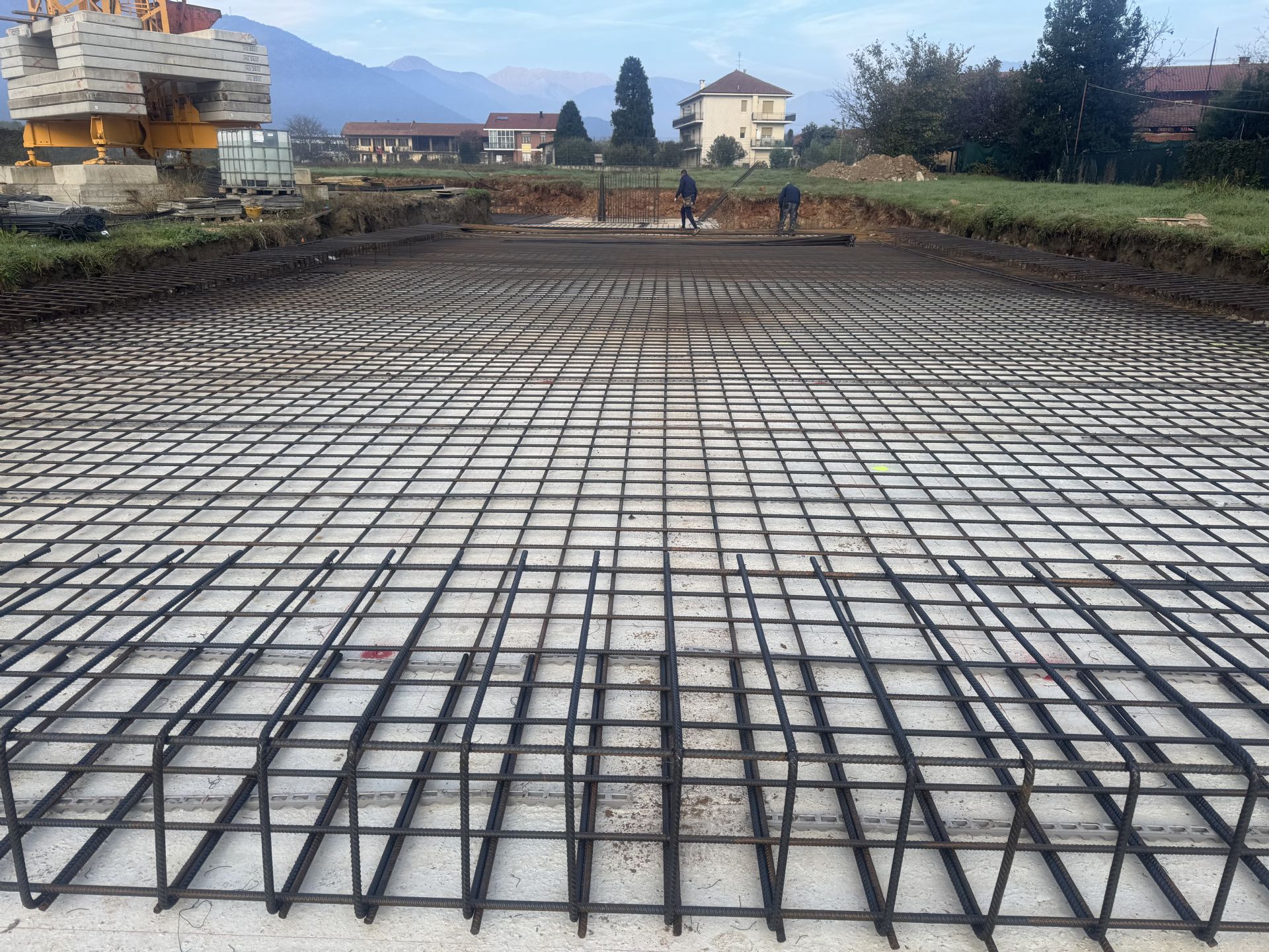 Oggi sono in corso i lavori di posa dell'armatura in acciaio della platea di fondazione della struttura portante antisismica.