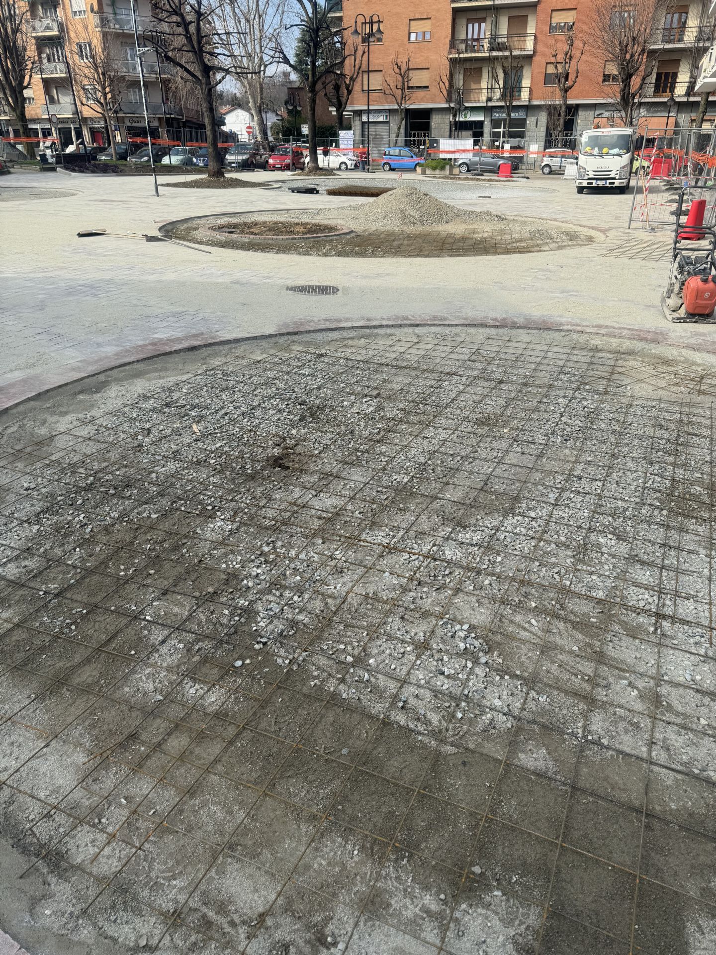 Oggi sono in corso i lavori di posa della rete elettrosaldata nelle isole centrali per la realizzazione del sottofondo armato per la stesura di finitura con calcestruzzo lavato.