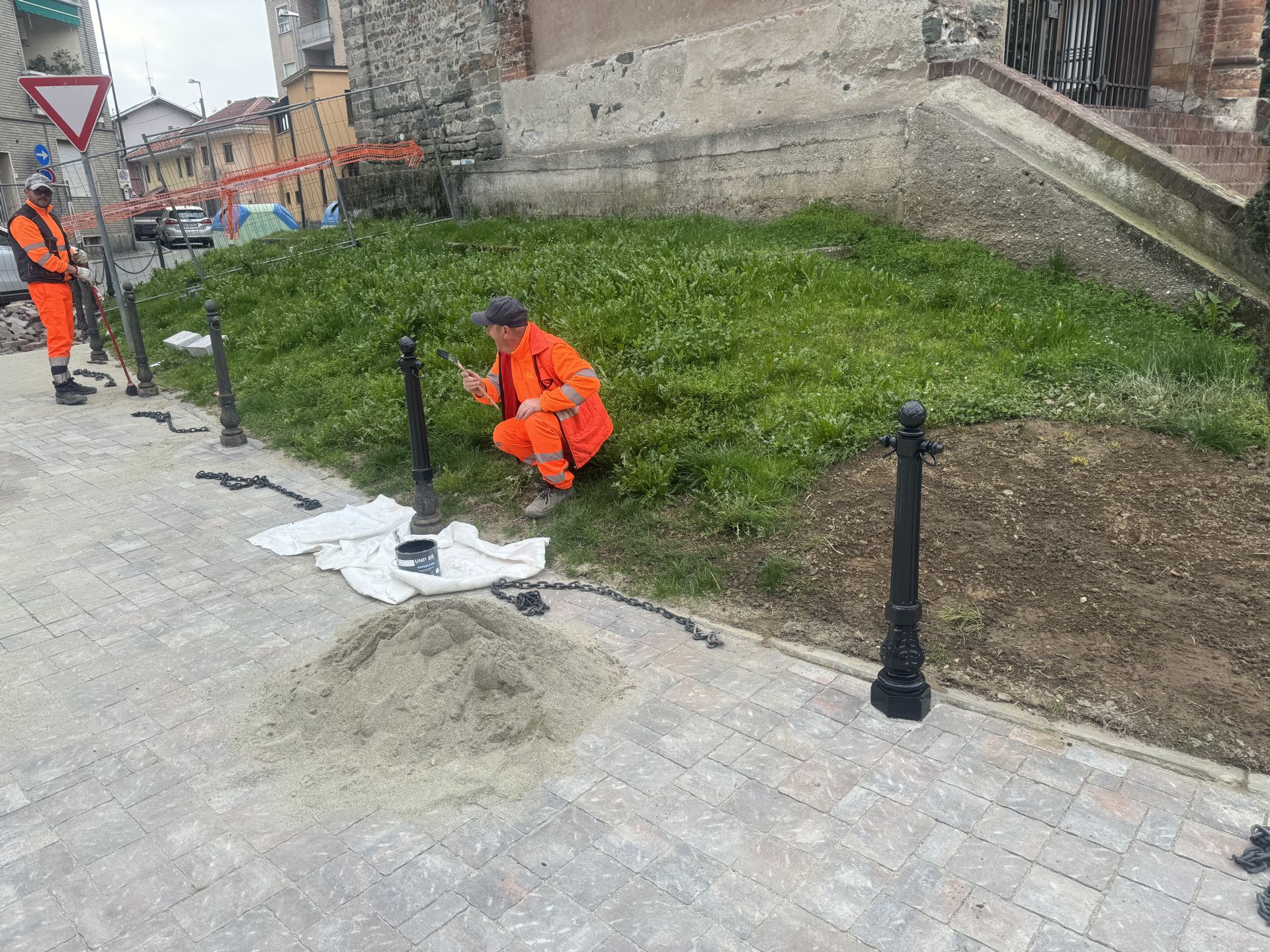 Oggi sono in corso i lavori di verniciatura dei paletti in ferro a delimitazione della piazza con la Cappella dei caduti.