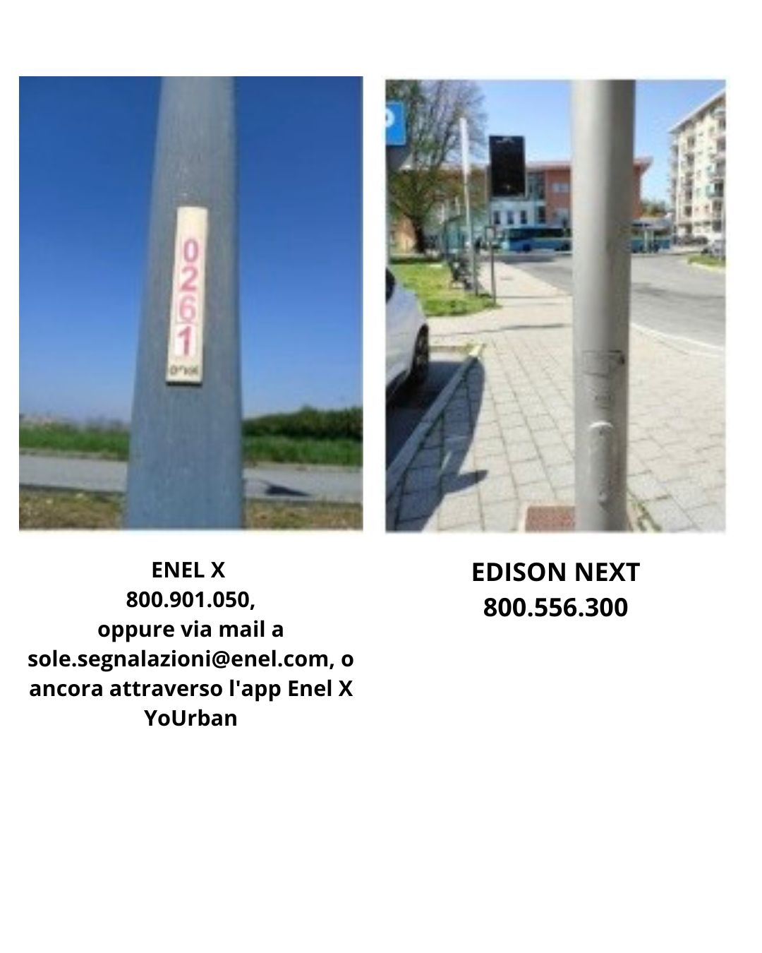 2. ENEL X per i pali su cui è riportata la scritta “Enel” o “Enel Sole” contattare il n. verde 800.901.050, oppure via mail a sole.segnalazioni@enel.com, o ancora attraverso l'app Enel X YoUrban