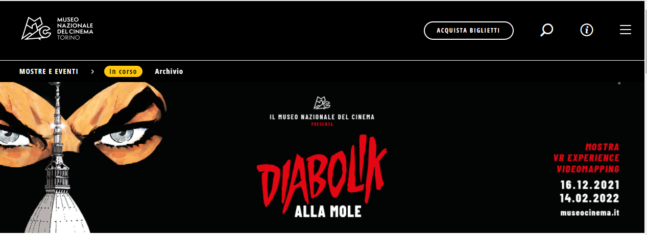In questo periodo è in corso la mostra Diabolik alla Mole, ospitata presso il Museo Nazionale del Cinema e curata da Luca Beatrice, Domenico De Gaetano e Luigi Mascheroni: l'esposizione occupa uno spazio espositivo mai utilizzato prima, al piano accoglienza. I fumetti, i disegni, le tavole originali e altre curiosità provenienti dagli archivi della casa editrice Astorina e da collezioni private, sono affiancati da immagini volte a ricostruire il clima da cronaca nera degli anni Sessanta che attraversava il Nord d'Italia, provenienti, queste, dall'Archivio Publifoto di Intesa San Paolo. Come è prevedibile, la mostra celebra non solo il personaggio, ma anche le versioni cinematografiche: sono presenti, infatti, foto e materiali di scena relativi sia al film di Mario Bava del 1968 sia a quello dei Manetti Bros dello scorso anno. Inoltre, l'allestimento è caratterizzato da oggetti d'arte e di design ispirati al gusto di Eva Kant, complice del famoso criminale.