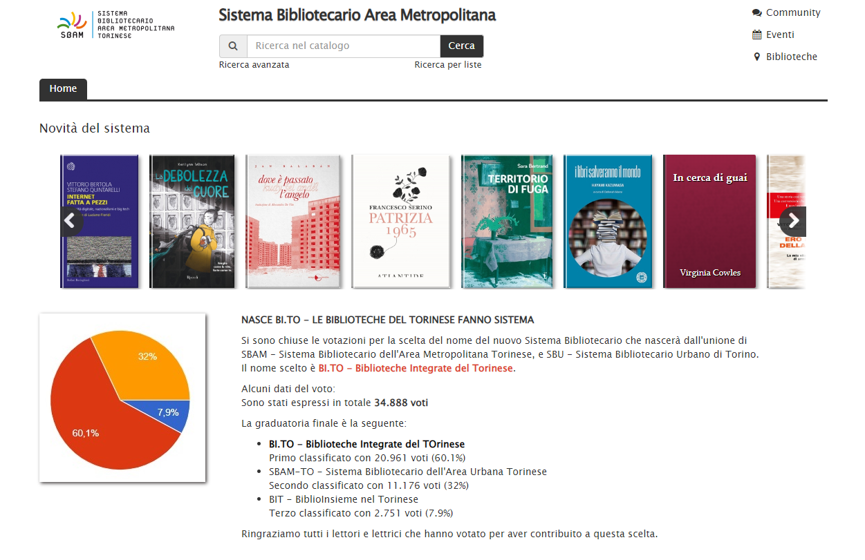 In questo caso, per esempio, dato che il nuovo software è lo stesso adottato dalle Biblioteche Civiche Torinesi è stato possibile attivare una funzionalità molto utile sia ai bibliotecari nello svolgimento dei servizi al pubblico sia direttamente ai lettori, ovvero il bi-opac. L'acronimo "opac" indica l'online public access catalogue, cioè il catalogo informatizzato consultabile liberamente online, mentre "bi" sta a indicare il raddoppio della funzionalità del catalogo: con una stessa ricerca si interroga sia il catalogo dello Sbam sia quello delle Biblioteche Civiche Torinesi, ottenendo una risposta dettagliata relativamente al catalogo su cui si sta operando e anche l'indicazione del numero di notizie con le stesse caratteristiche presenti nell'altro sistema bibliotecario; se si è interessati, con un paio di click si approda sull'altro opac e nel caso in cui si fosse in possesso delle credenziali per accedere all'area lettori si può procedere con la prenotazione del titolo che si desidera. Il catalogo delle Biblioteche Civiche Torinesi si comporta in modo analogo con quello dello Sbam.