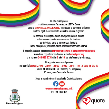 Si avvisano i Cittadini che in 𝐜𝐨𝐥𝐥𝐚𝐛𝐨𝐫𝐚𝐳𝐢𝐨𝐧𝐞 𝐜𝐨𝐧 l' Associazione +𝐐𝐮𝐨𝐫𝐞, lo sportello d'ascolto 𝐋𝐆𝐁𝐓+ è aperto negli orari descritti in locandina