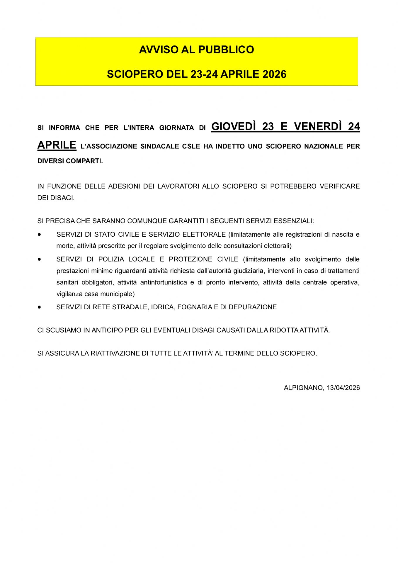 si informa che per l’intera giornata di giovedì 23 e venerdì 24 aprile l’associazione sindacale csle ha indetto uno sciopero nazionale per diversi comparti.