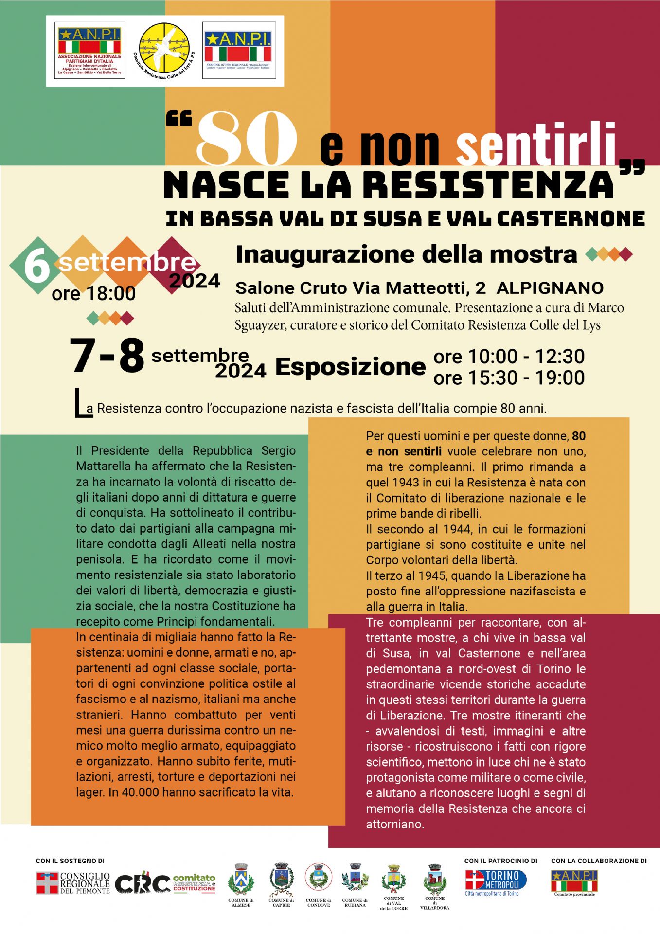La mostra celebra tre compleanni: la nascita della Resistenza, il momento in cui le formazioni partigiane si sono costituite e unite nel corpo Volontari della Libertà e la Liberazione. Tre compleanni che raccontano le vicende accadute nel nostro territorio e che aiutano a riconoscere luoghi e segni di memoria della Resistenza che ancora ci circondano.