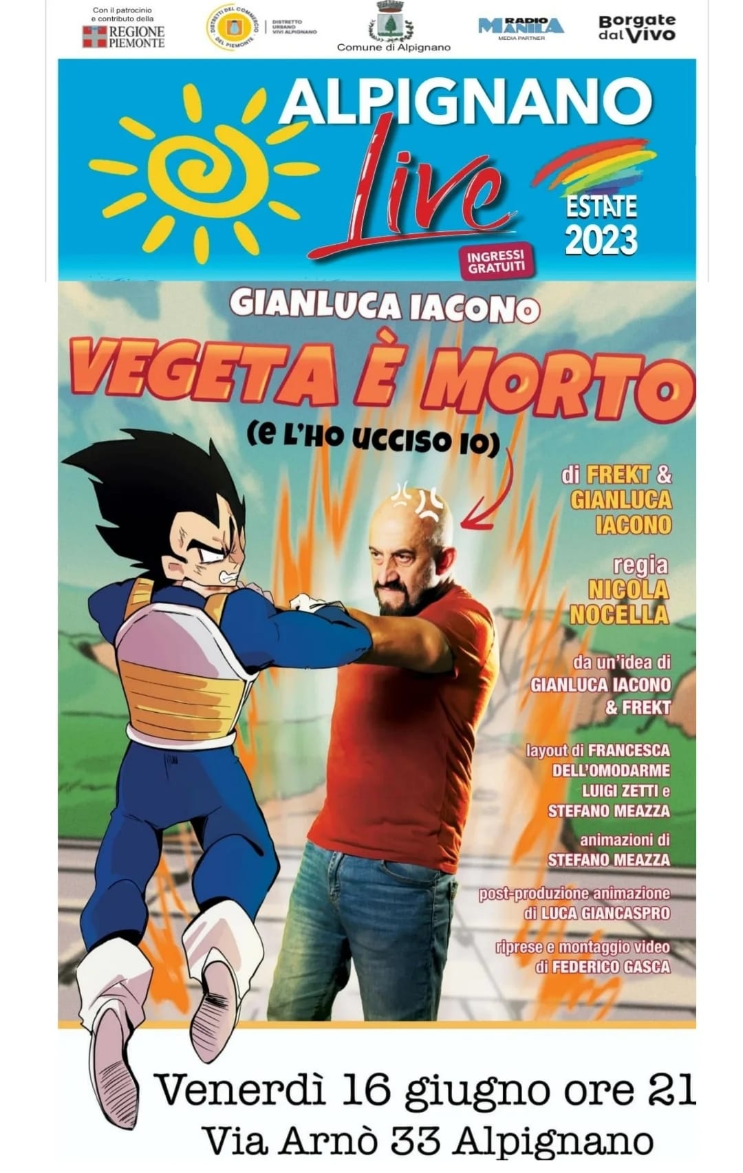 Venerdì 16 giugno, alle ore 21, aspetteremo che cali il sole per assistere alla PRIMA REGIONALE dello spettacolo "Vegeta è morto (e l'ho ucciso io)" con il doppiatore Gianluca Iacono, voce di Vegeta, nelle serie di Dragon Ball, Marshall Eriksen in How I Met Your Mother, Gordon Ramsay, Heath Ledger, Joaquin Phoenix e Gerard Butler.