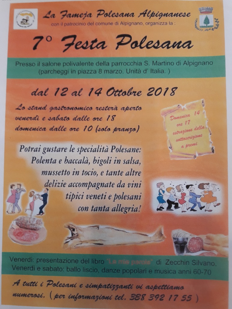 La Fameja Polesana alpignanese organizza la 7^ edizione della Festa Polesana: stand gastronomico con specialità polesane, ballo liscio, danze popolari e presentazione del libro "Le mie parole" di Zecchin Silvano.
