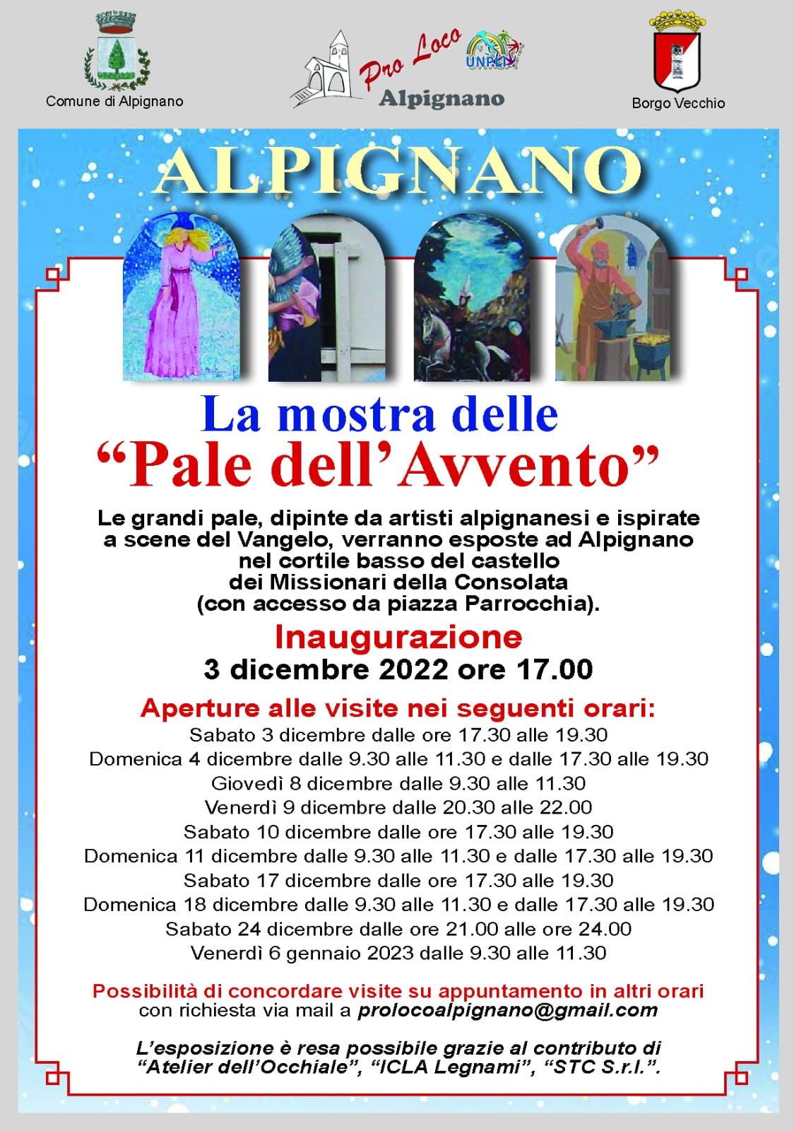 Le grandi pale, dipinte da artisti alpignanesi e ispirate a scene del Vangelo, verranno esposte ad Alpignano nel cortile basso del Castello dei Missionari della Consolata, con accesso da Piazza Parrocchia a cura della Pro Loco Alpignano e del Borgo Vecchio.