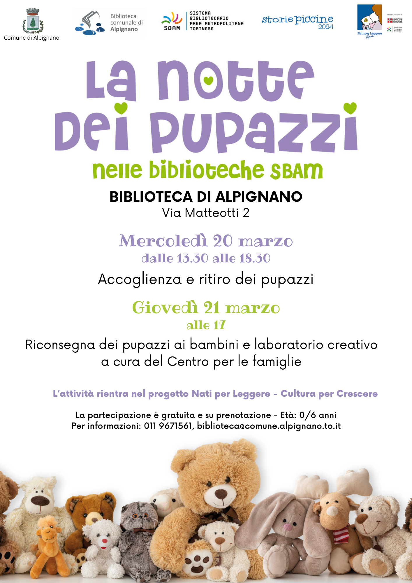 Le biblioteche dello Sbam, nell'ambito del progetto “Nati per leggere – Cultura per crescere”, realizzato grazie al contributo di Regione Piemonte e Fondazione Compagnia di San Paolo, propongono "La notte dei pupazzi", attività che si inserisce a pieno titolo tra le azioni caratteristiche del progetto in quanto presenta il libro illustrato come diffusore affettivo: prendersi cura di qualcuno significa anche dedicargli del tempo, immaginare che cosa gli piace, spiegare pagine e storie. Questa proposta si ritiene possa avere valenze positive anche sull'incentivazione della lettura in famiglia.