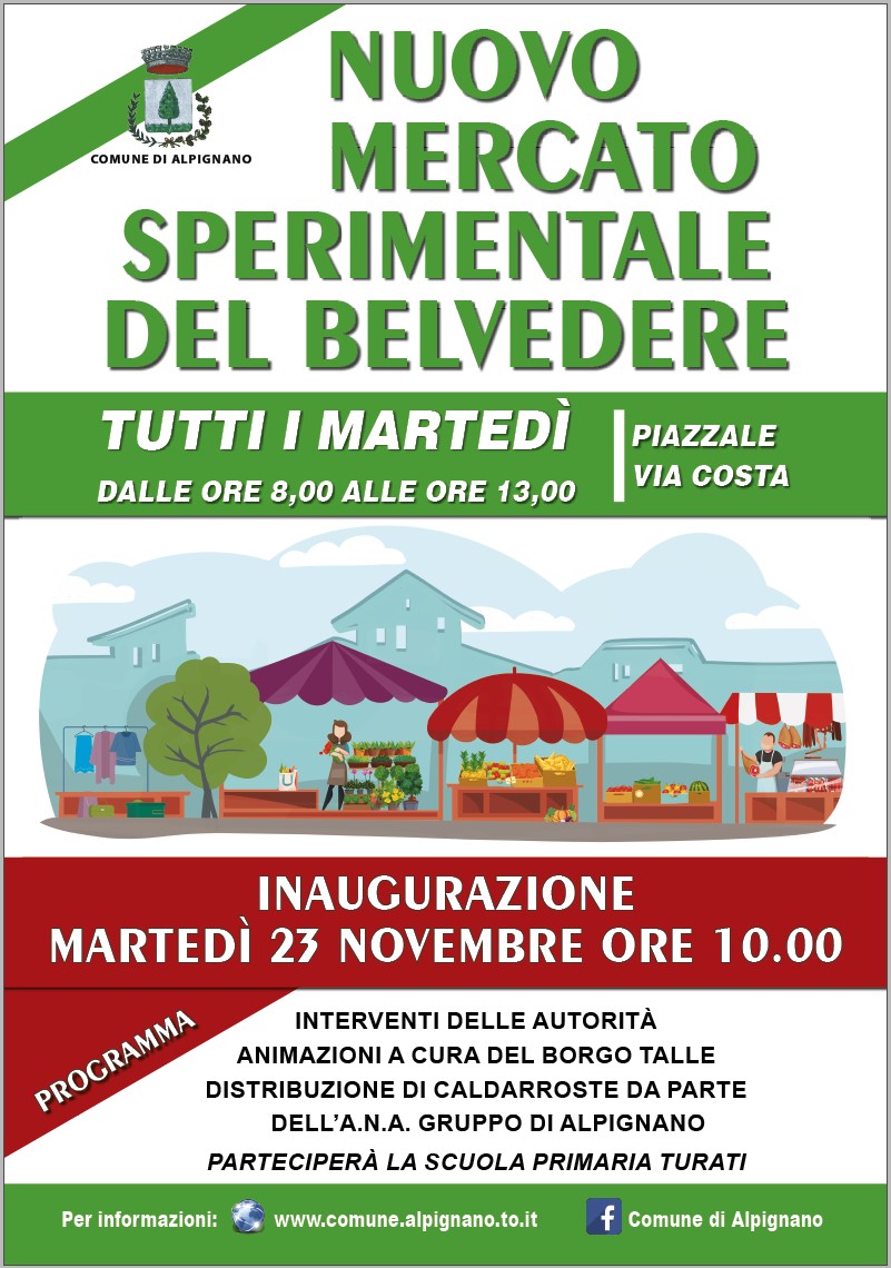 Il mercato sarà inaugurato martedì 23 novembre, alle ore 10, con un momento di festa. Animazioni a cura del Borgo Talle e distribuzione di caldarroste da parte dell'Associazione ANA Gruppo di Alpignano. Parteciperà la Scuola Primaria Turati.
