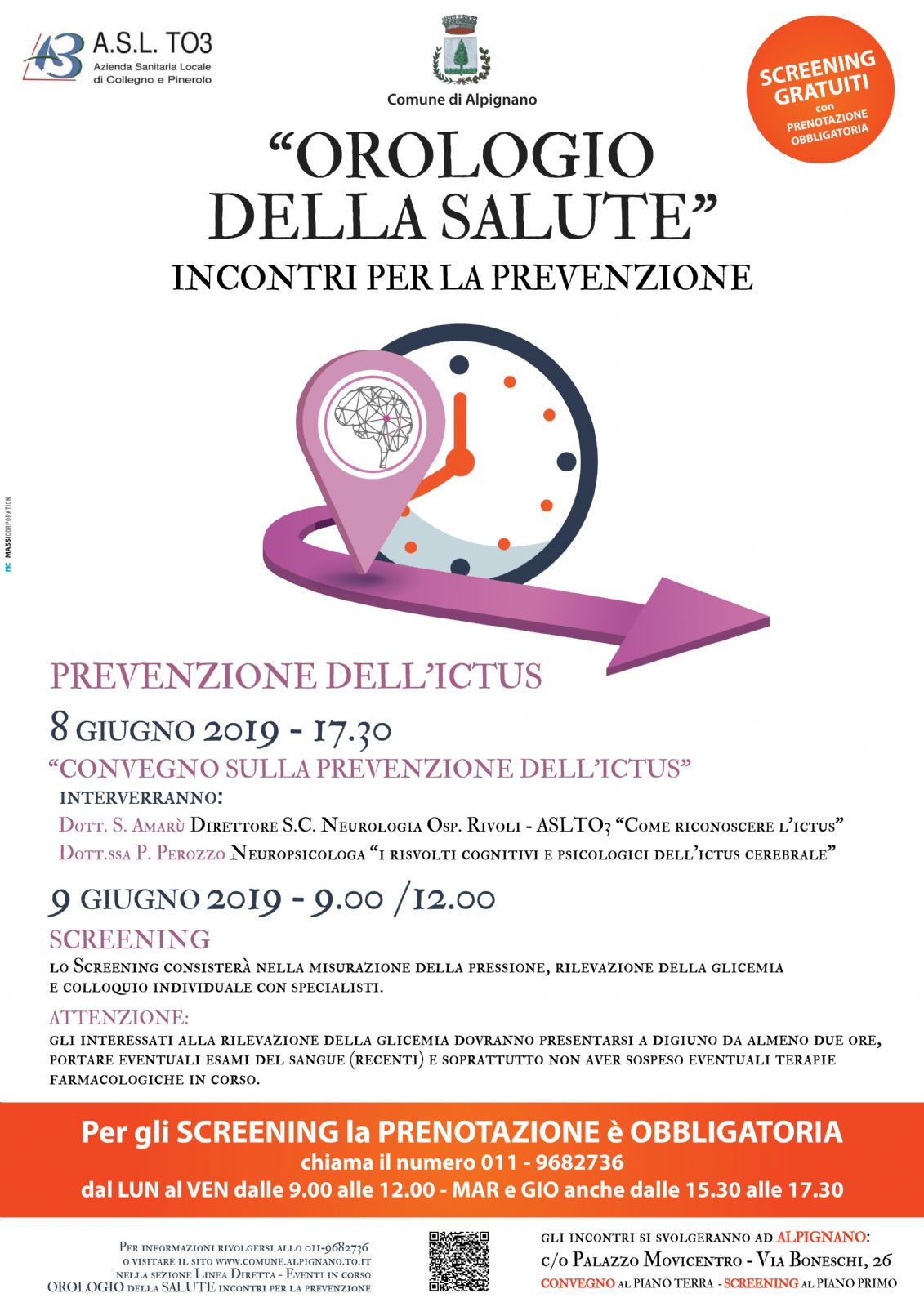 Nell'ambito dell'iniziativa "Orologio della salute" incontri per la prevenzione, vi segnaliamo il Convegno sulla prevenzione dell'ictus: come riconoscere l'ictus e i risvolti cognitivi e psicologici, sabato 8 giugno alle ore 17.30 presso il Palazzo Movicentro, via Boneschi 26, Alpignano.