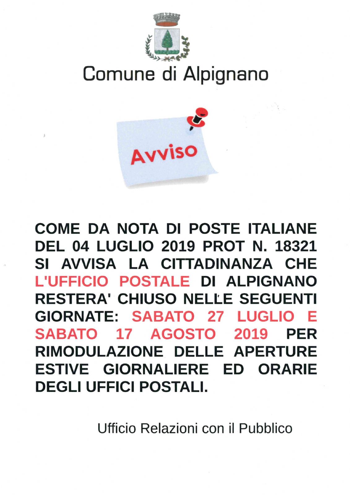 SI INFORMA LA CITTADINANZA CHE L'UFFICIO POSTALE DI ALPIGNANO RESTERA' CHIUSO SABATO 27 LUGLIO E SABATO 17 AGOSTO 2019.