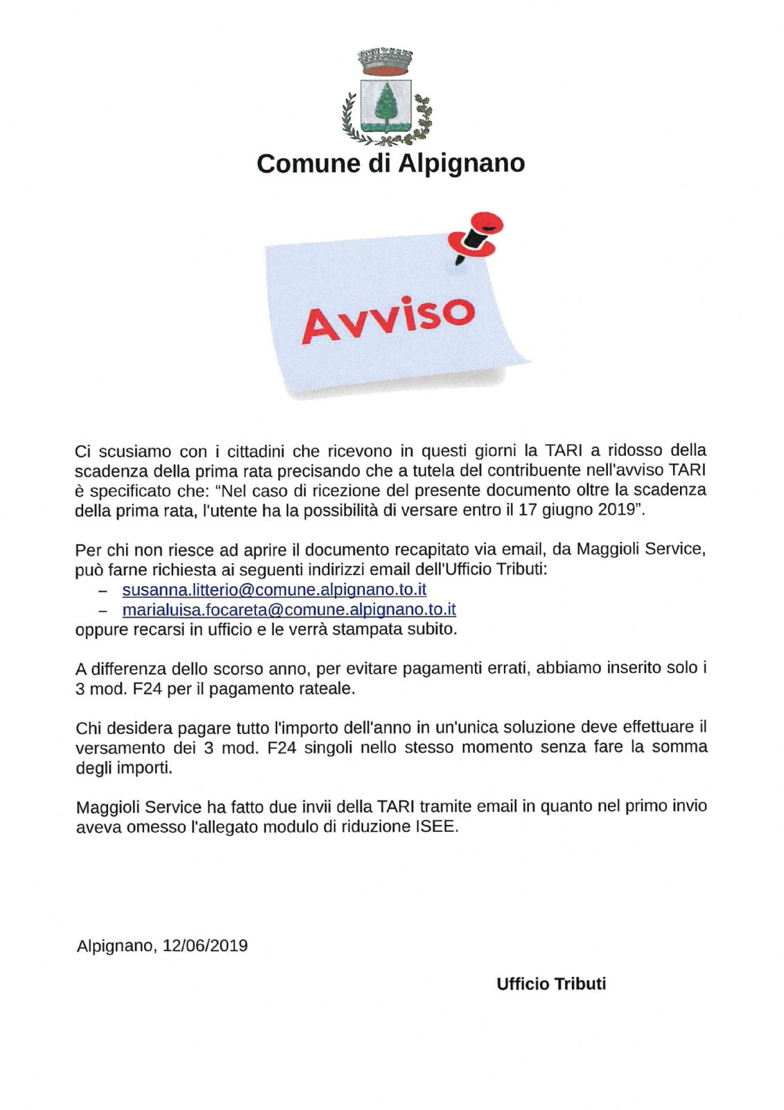 NEL CASO DI RICEZIONE DEL PRESENTE DOCUMENTO OLTRE LA SCADENZA DELLA PRIMA RATA, L'UTENTE HA LA POSSIBILITA' DI VERSARE ENTRO IL 17 GIUGNO 2019.