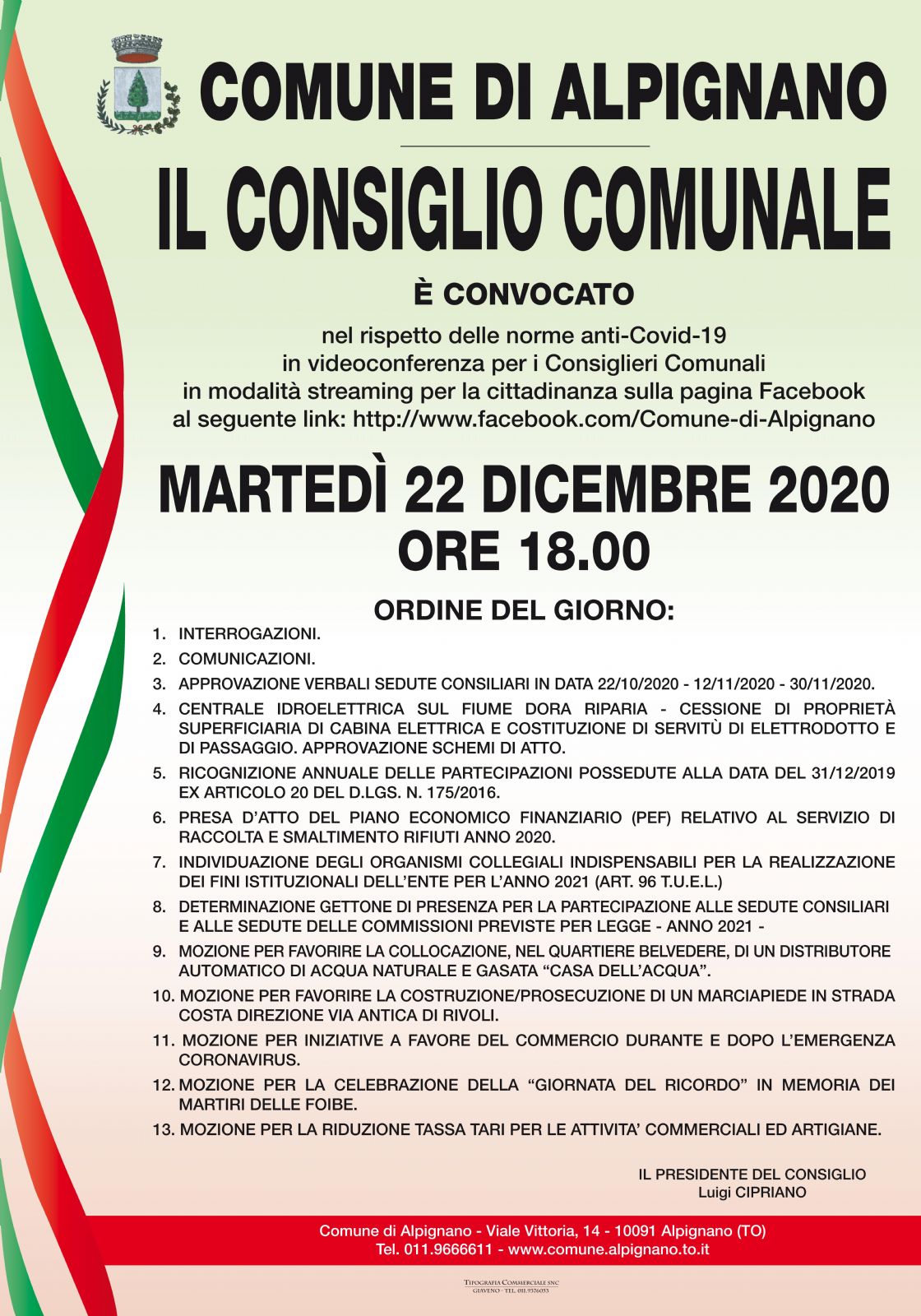 Il Consiglio Comunale di martedì 22 dicembre, ore 18:00, nel rispetto delle norme anti Covid-19, sarà in videoconferenza per i Consiglieri Comunali e in modalità streaming per la cittadinanza sulla pagina facebook Comune di Alpignano, al link sotto indicato.