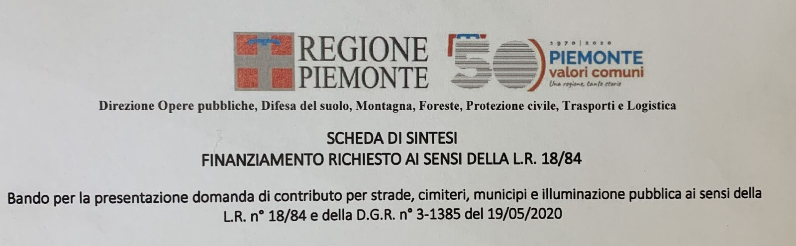 L’Ufficio Tecnico Area Lavori Pubblici informa che è stata presentata domanda al bando per la richiesta del contributo regionale finalizzato alla sistemazione di alcune aree all'interno del cimitero comunale ai sensi della L.R. n. 18/84 e della D.G.R. n. 3-1385 del 19/05/2020.