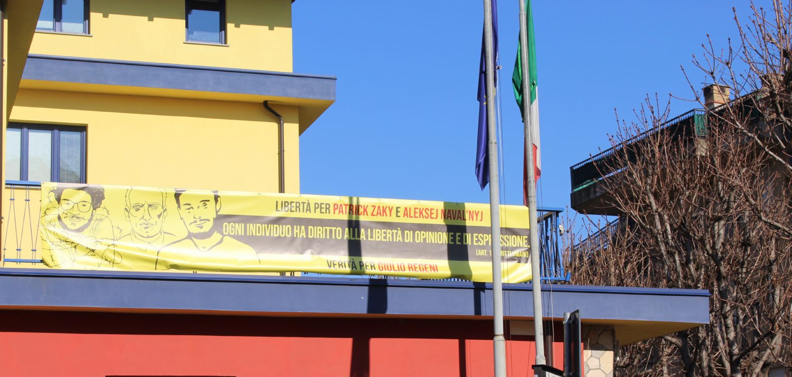 Uno striscione in memoria di Giulio Regeni e per chiedere la liberazione di Patrick Zaki e Aleksej Navalny è stato appeso oggi sul terrazzo della sede comunale in Viale Vittoria.
