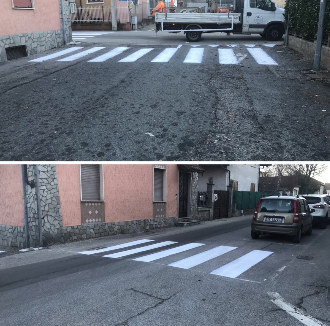 L’Ufficio Tecnico Area Lavori Pubblici informa che nell’ambito del piano per la messa in sicurezza di strade e marciapiedi è stata realizzata la nuova segnaletica orizzontale di attraversamento pedonale per raggiungere la fermata del "piedibus" in via Cavaliere Mussino.