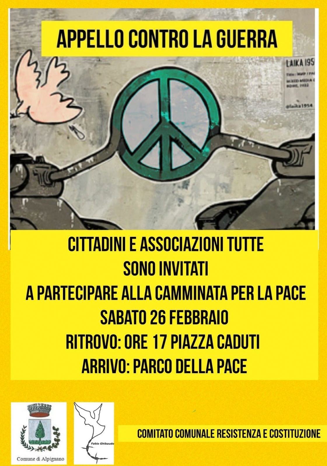 L'Amministrazione Comunale e il Comitato Comunale Resistenza e Costituzione invitano cittadini e associazioni tutte a partecipare sabato 26 febbraio alla "Camminata per la Pace" per dire NO alla follia della Guerra.