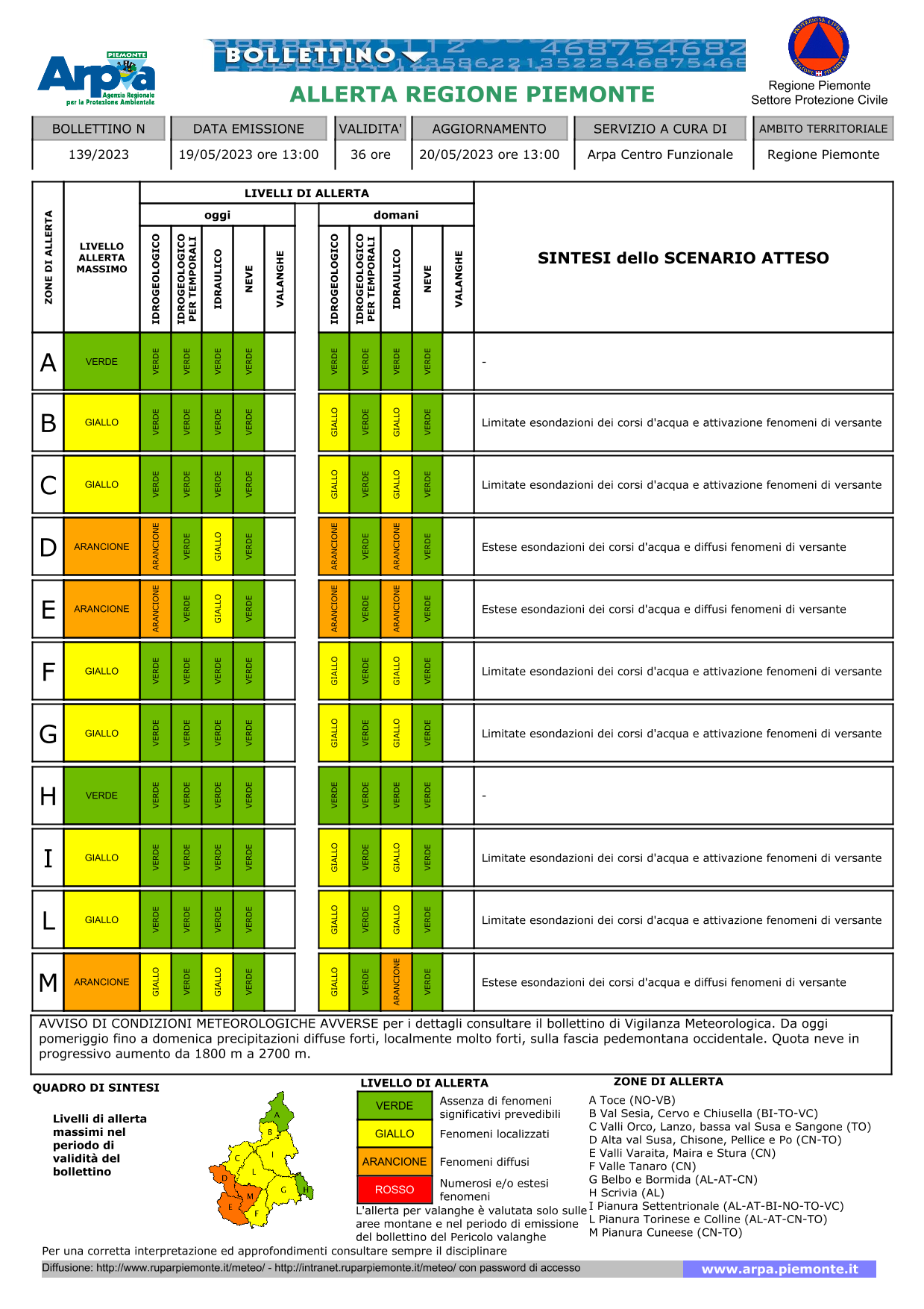 L'ARPA Piemonte ha diramato il proprio Bollettino n° 139/2023 del 19 maggio 2023, valevole fino alle ore 13:00 del 20 maggio, indicando per la nostra zona (L) allerta gialla, con limitate esondazioni dei corsi d'acqua e attivazione di fenomeni di versamento.