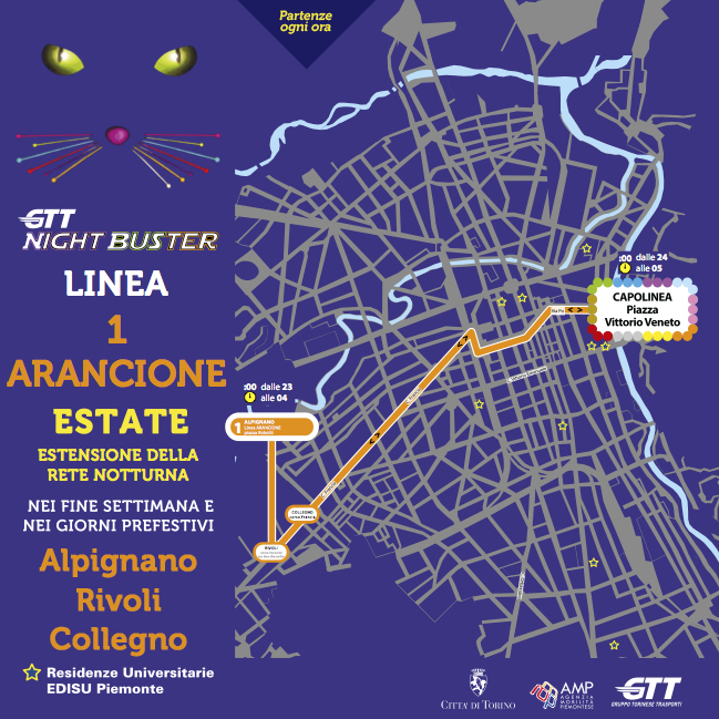 Da questa sera 𝟐𝟖 𝐆𝐢𝐮𝐠𝐧𝐨 𝐚𝐥 𝟕 𝐒𝐞𝐭𝐭𝐞𝐦𝐛𝐫𝐞 p.v. nelle giornate di 𝐯𝐞𝐧𝐞𝐫𝐝𝐢̀, 𝐬𝐚𝐛𝐚𝐭𝐨 𝐞 𝐧𝐞𝐢 𝐠𝐢𝐨𝐫𝐧𝐢 𝐩𝐫𝐞𝐟𝐞𝐬𝐭𝐢𝐯𝐢 viene attivata la 𝐫𝐞𝐭𝐞 𝐧𝐨𝐭𝐭𝐮𝐫𝐧𝐚 𝐆𝐓𝐓 potenziata con 17 linee che collegano 29 Comuni dell’Area Metropolitana al centro della Città di Torino. I bus di tutte le linee notturne partiranno dai capolinea periferici per giungere al capolinea centrale di Torino in piazza Vittorio Veneto.