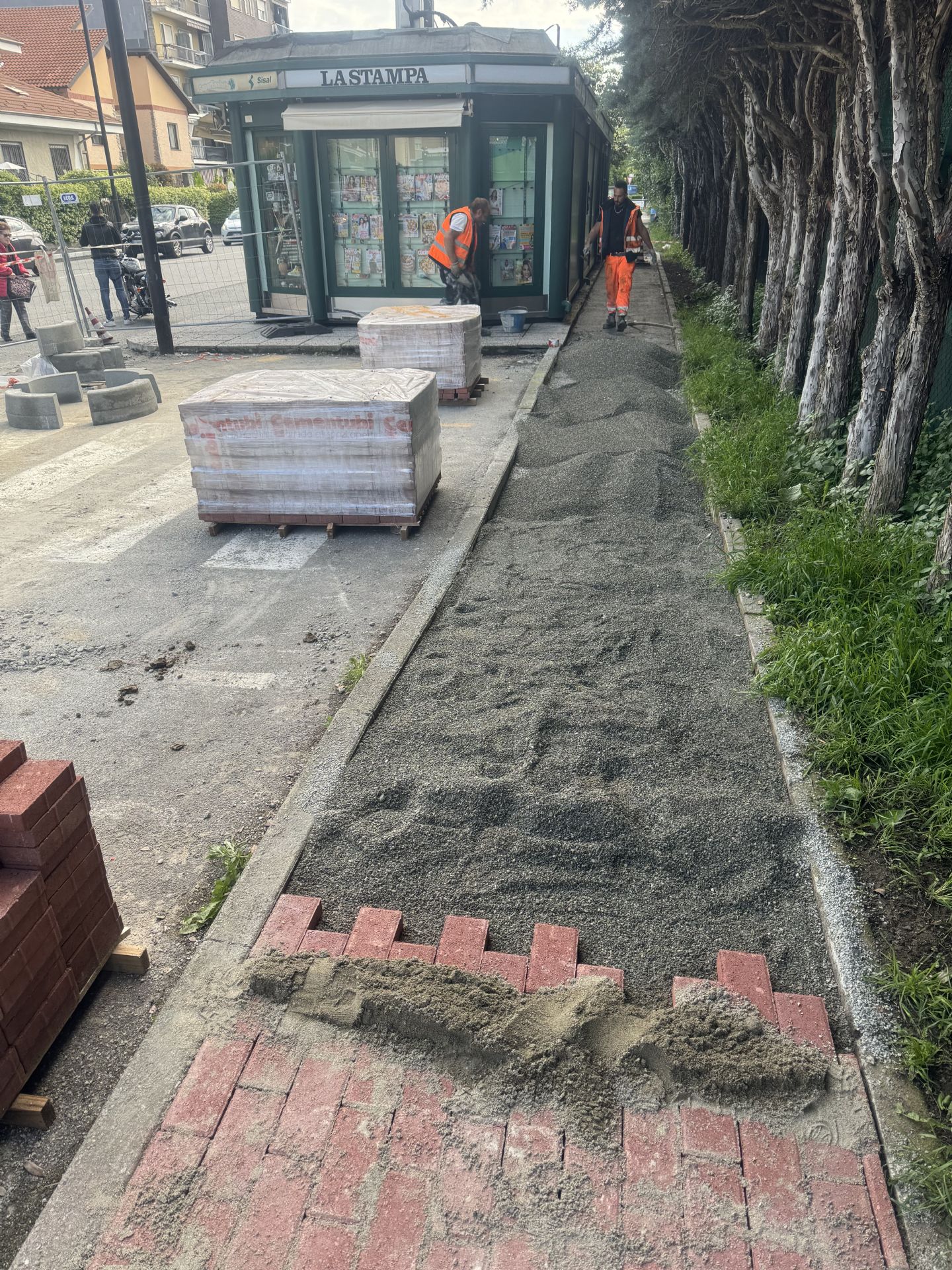 Oggi sono in corso i lavori di completamento del sottofondo del nuovo marciapiede (PEBA) di via Cavour nel tratto compreso tra il tennis comunale e via Rossini.