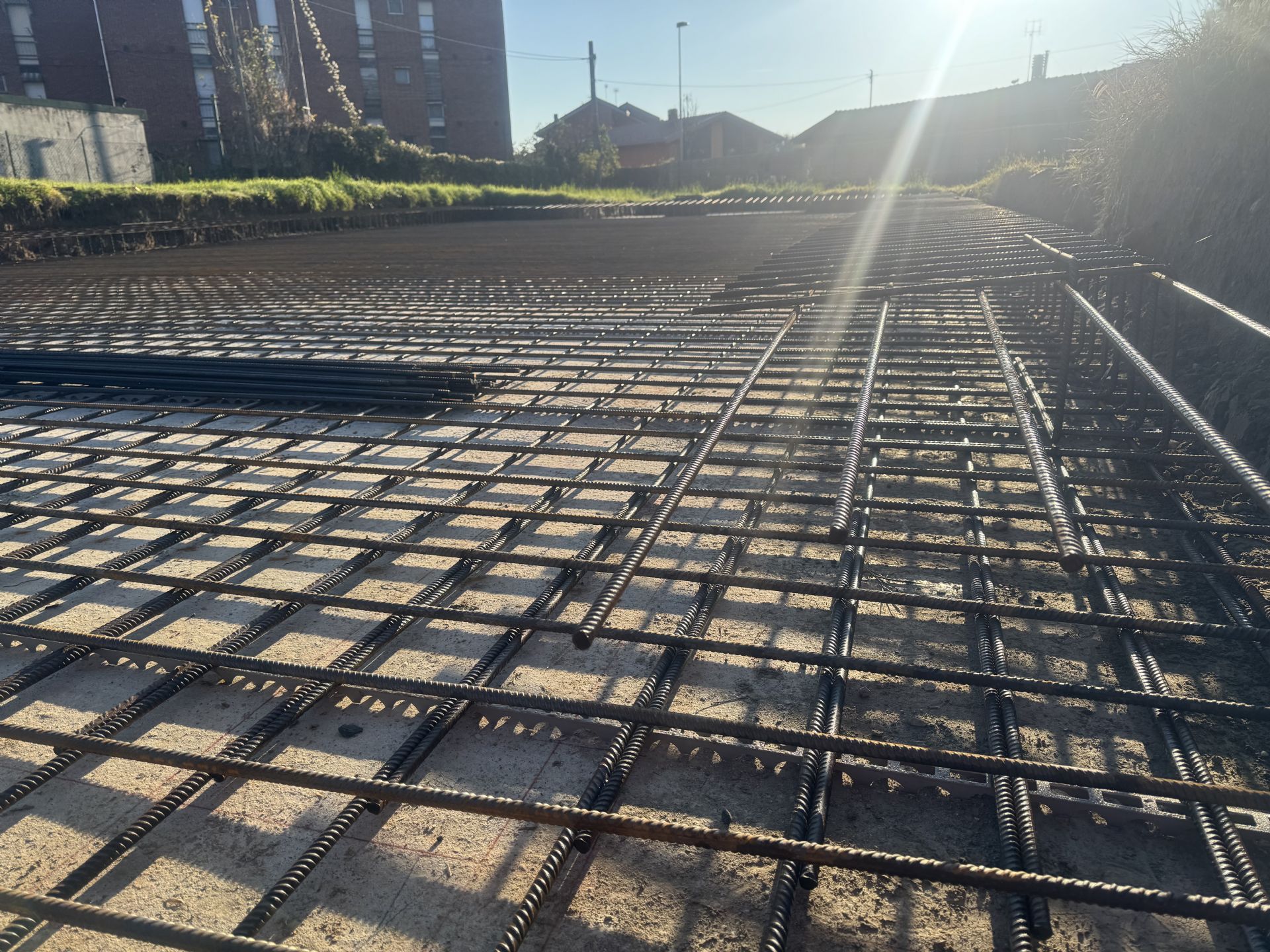 Oggi sono in corso i lavori di posa dell'armatura in acciaio della platea di fondazione della struttura portante antisismica.
