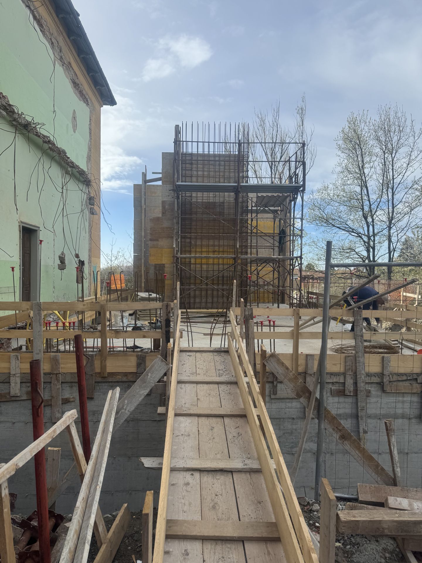 Continuano i lavori per la realizzazione della carpenteria dei setti e del vano ascensore in cemento armato dalla quota del solaio del piano terra al solaio del piano primo. Tale lavorazione è funzionale per la realizzazione del nuovo blocco servizi della villa storica.