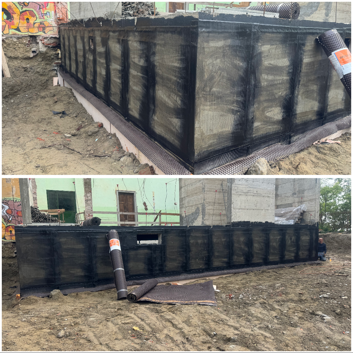 Oggi è in fase di completamento la posa della membrana impermeabilizzante della parte superiore del muro controterra del nuovo edificio a servizio della villa storica.
