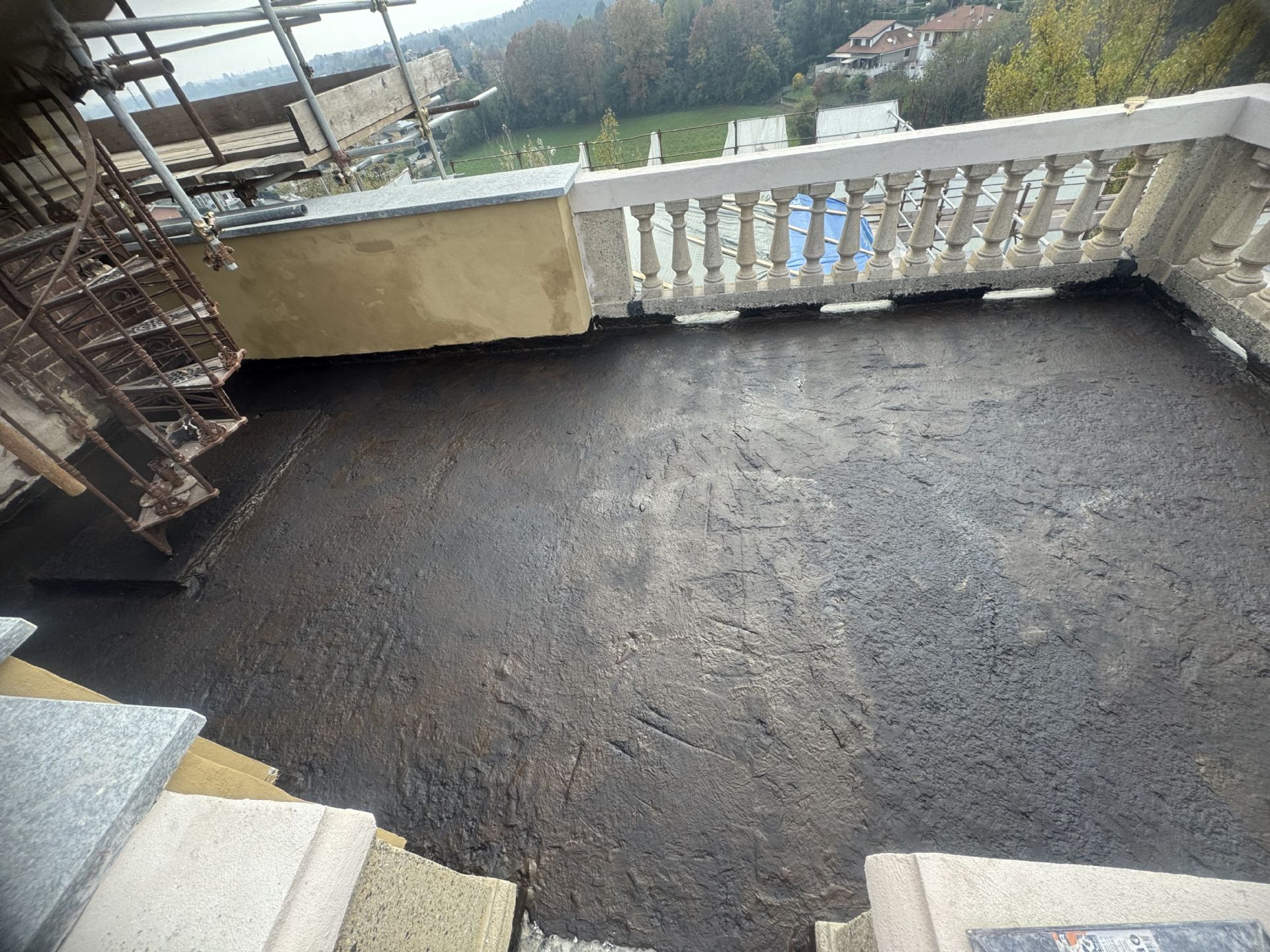 - stesura primer bituminoso di sottofondo per la successiva posa della membrana bituminosa al piano terrazzino della villa storica e al piano copertura del nuovo edificio;