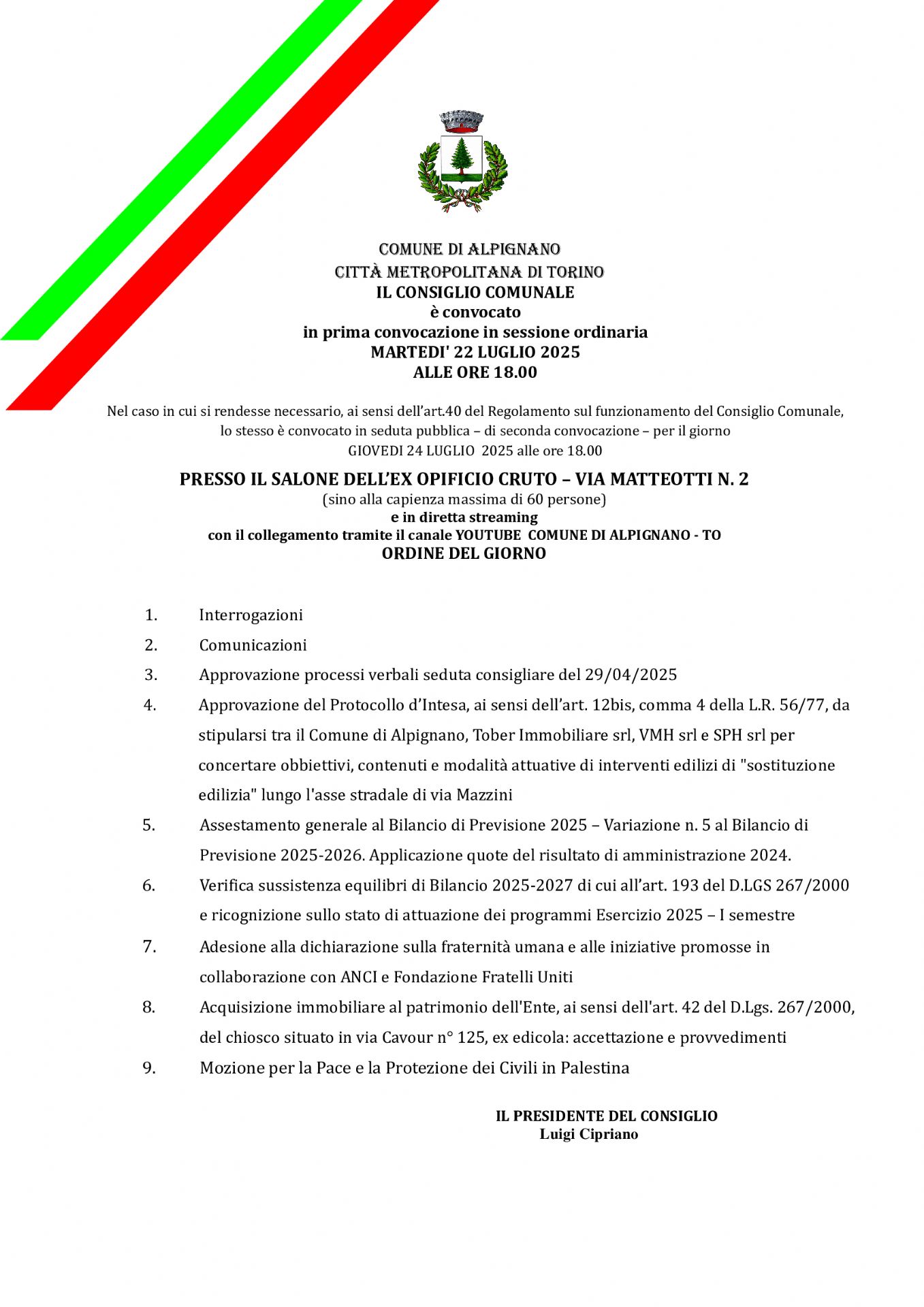 Il Consiglio comunale è convocato MARTEDI 22 LUGLIO alle ore 18