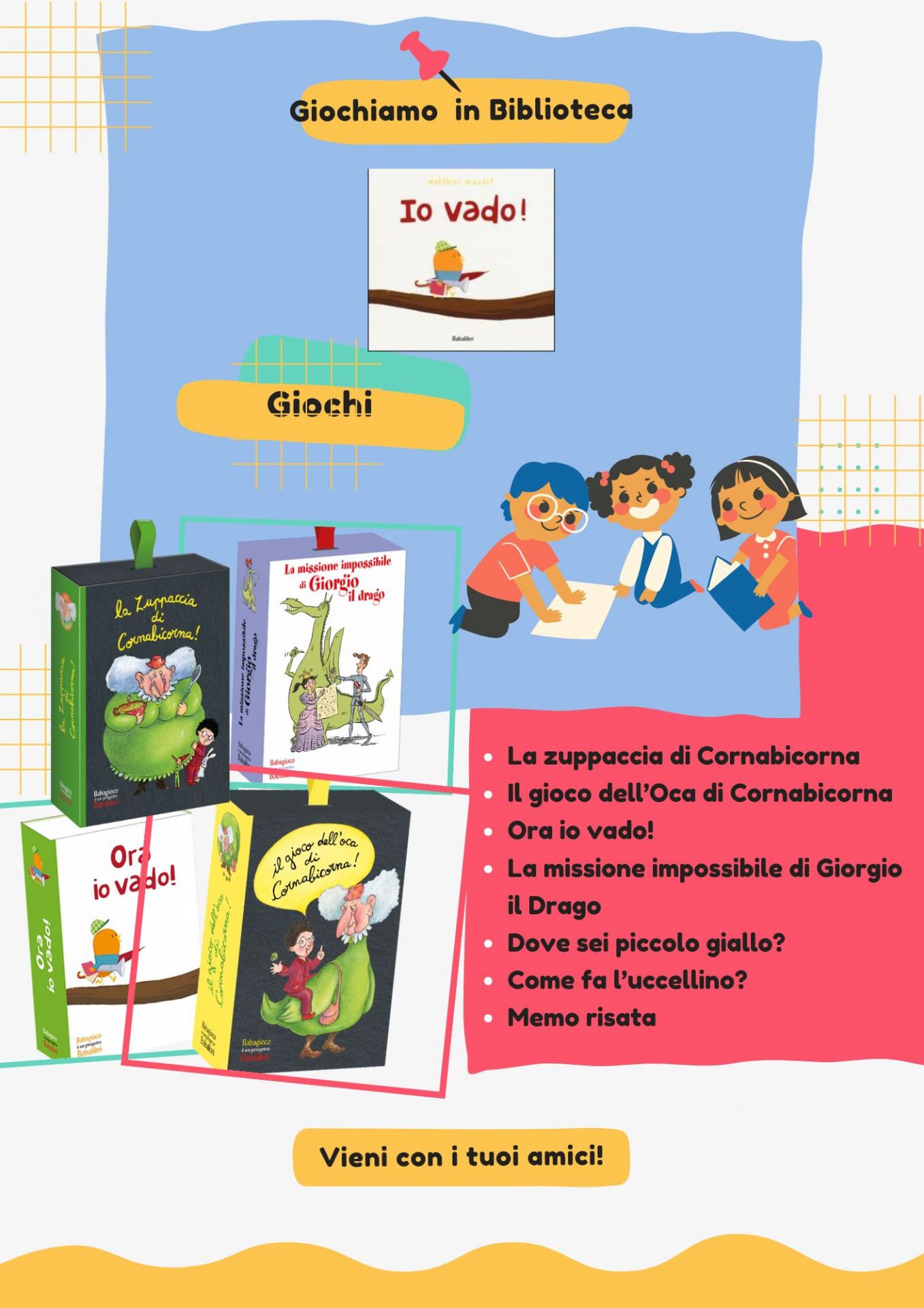 In Biblioteca puoi trovare numerosi giochi che rimandano ai contenuti dei libri o che per alcune caratteristiche offrono un proseguimento dell’esperienza di lettura
