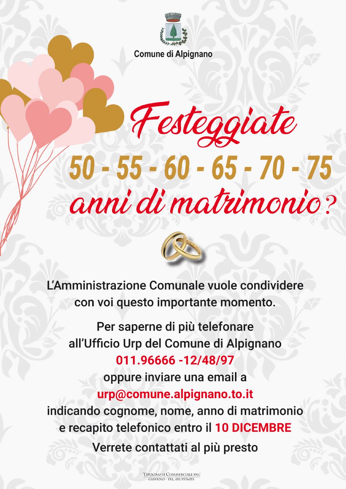 Per saperne di più telefonate all'Ufficio URP del Comune al numero 011966.66.12/48/97 oppure scrivete all'indirizzo mail urp@comune.alpignano.to.it - entro il 10 dicembre - indicando: cognome, nome, anno di matrimonio e recapito telefonico e verrete richiamati.
