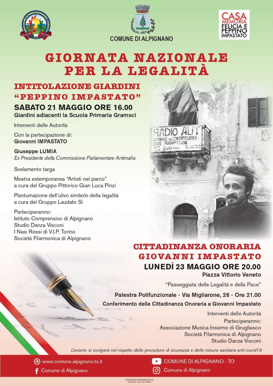Sabato prossimo 21 maggio , i giardini adiacenti alla scuola Gramsci verranno intitolati a Peppino Impastato, il giornalista che il 9 maggio 1978 venne assassinato dalla mafia. La decisione di intitolare i giardini è stata presa all'unanimità dal Sindaco Steven Giuseppe Palmieri e dal Consiglio Comunale su specifica indicazione dell'Associazione Calabresi di Alpignano Caselette, sancita ufficialmente con provvedimento dal primo cittadino.