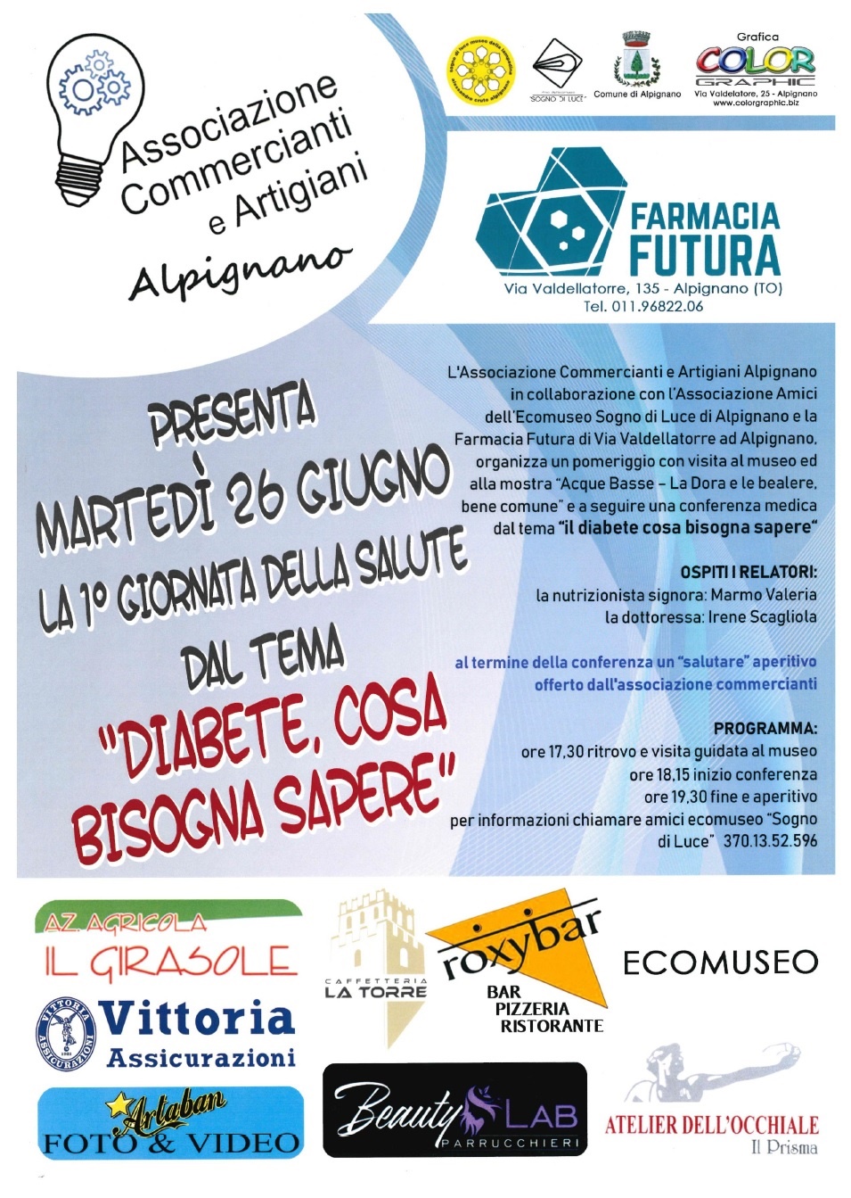 L'associazione commercianti e gli Amici dell'Ecomuseo Sogno di Luce sono lieti di invitarvi alla prima prima giornata della salute di martedì 26 giugno dalle ore 17,30 presso l'Ecomuseo Sogno di Luce di Alpignano, via Matteotti n. 2.