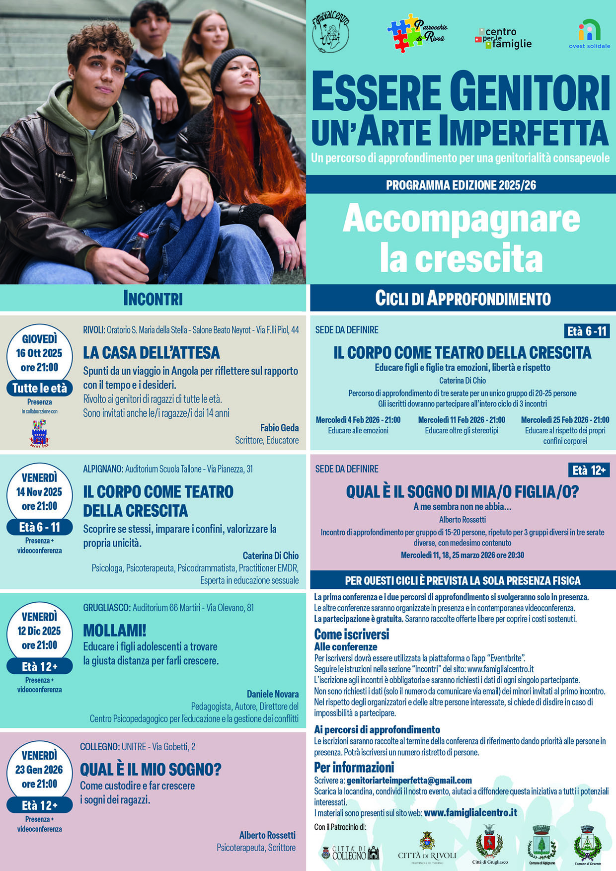 Il Comune di Alpignano patrocina i nuovi incontri e i cicli di approfondimento dedicati a genitori e famiglie, organizzati dall'Associazione Famiglia al Centro.